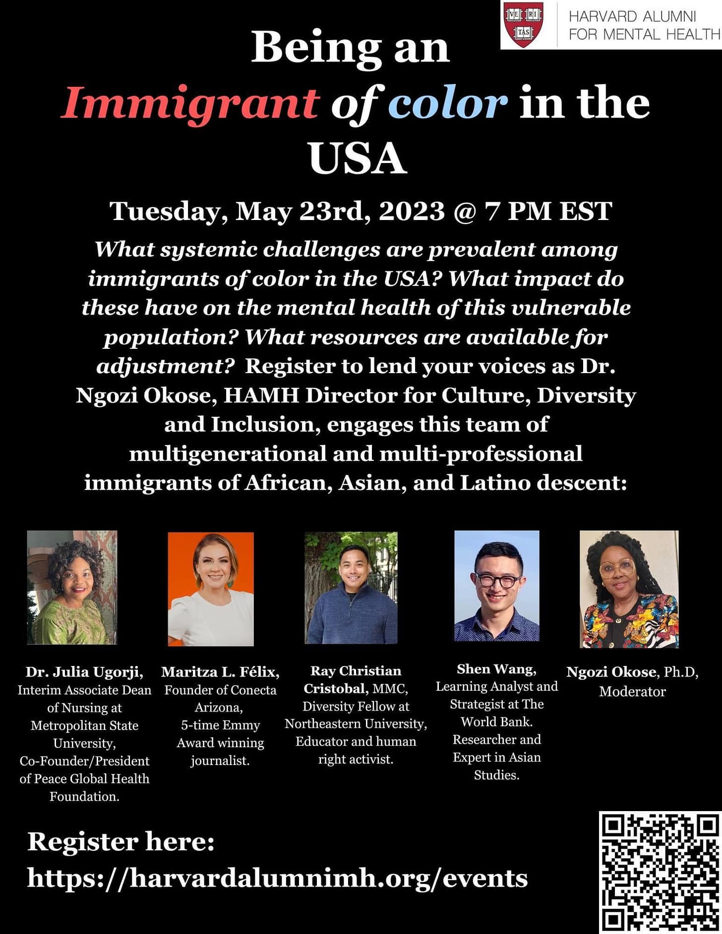✅ Esta semana, nuestra directora Maritza L. Félix participó como expositora en el panel “Ser inmigrante de color en Estados Unidos”, realizado por Harvard Alumni for Mental Health, organización sin fines de lucro de la Universidad de Harvard que conecta a exalumnos y estudiantes para concientizar y promover el acceso a la salud mental, y que indagó sobre los desafíos que, en este aspecto, presentan los inmigrantes hispanos, entre otros.