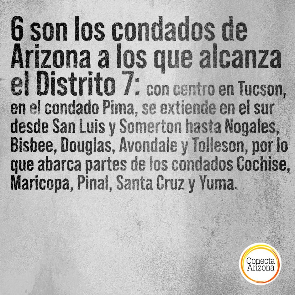 La administración del proceso electoral está a cargo de los seis condados que forman parte del Distrito 7: Cochise, Maricopa, Pima, Pinal, Santa Cruz y Yuma. Con centro en Tucson, en el condado Pima, el Distrito se extiende en el sur -en la frontera con México- desde San Luis y Somerton hasta Nogales, Bisbee, Douglas, Avondale y Tolleson. En total, el Distrito tiene 59,328 kilómetros cuadrados de superficie terrestre y es el segundo más grande de Arizona. Además, se extiende a lo largo de 563 kilómetros en la frontera con México, tiene una amplia población hispana y alberga a cuatro naciones tribales soberanas: Cocopah, Pascua Yaqui, Quechan y Tohono O’odham.