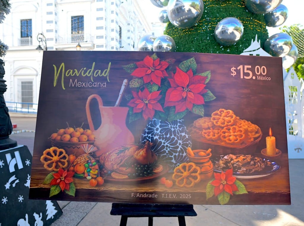 La imagen nos muestra flores de nochebuena en un florero de cerámica de talavera, pavo, buñuelos de viento, tejocotes, ponche (que es una bebida tradicional de temporada invernal, navideña, con frutas y canela), servida en pocillos de barro, dulces que se comparten en las posadas y reuniones navideñas. Estos son algunos de los elementos de la cultura mexicana, no sólo de Sonora sino de todo el país.