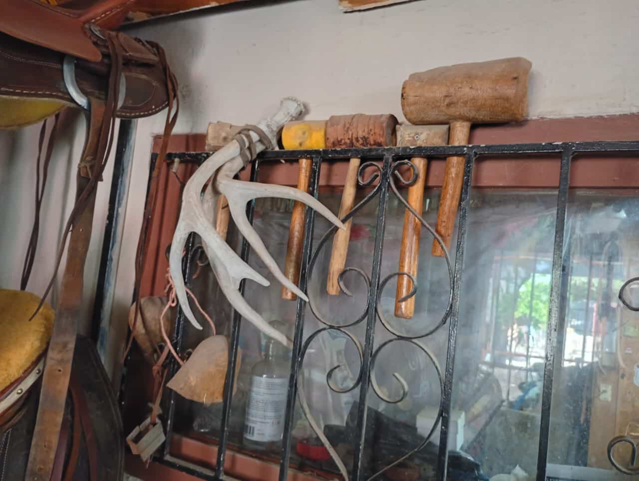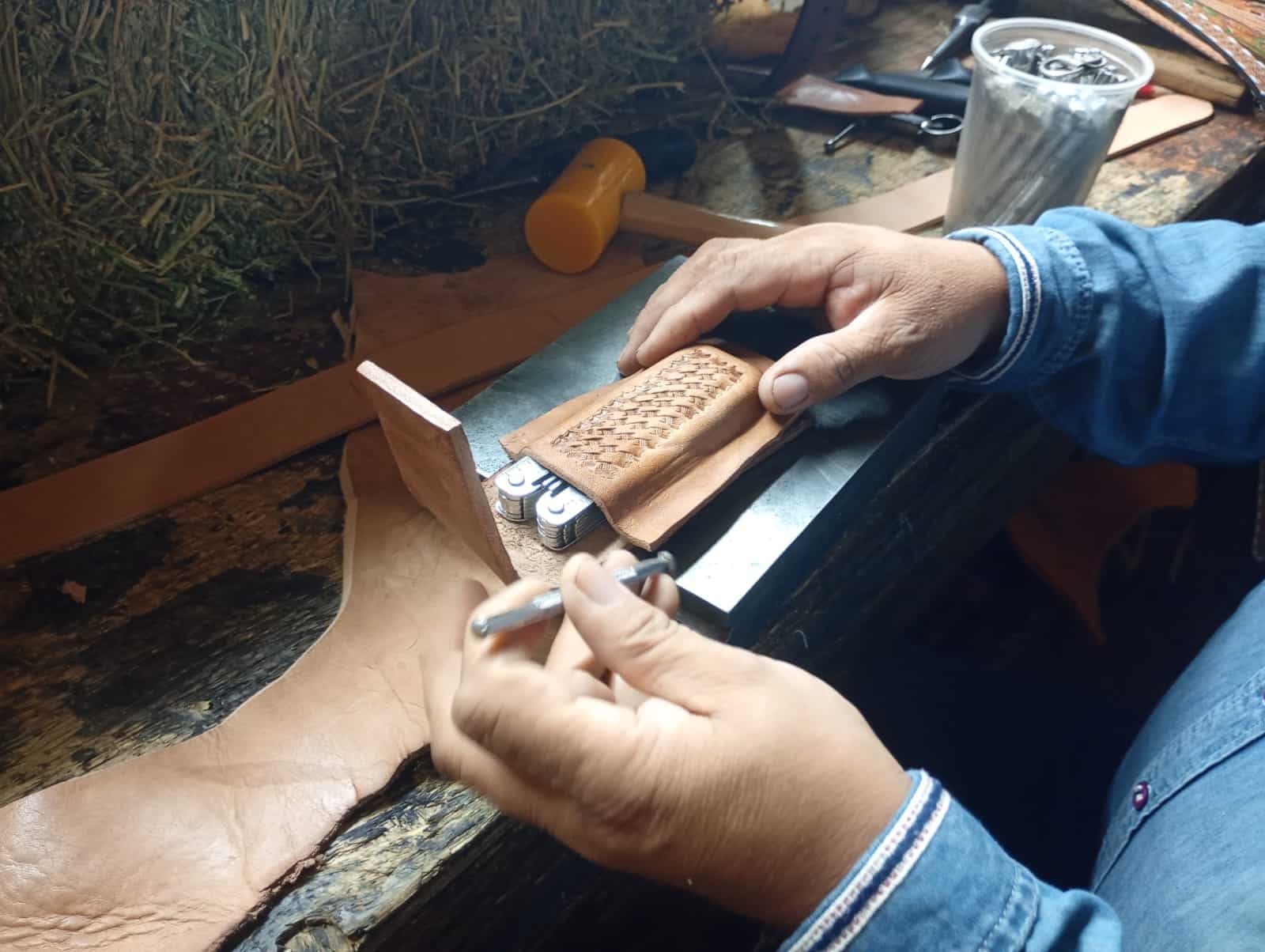 El siguiente elemento que compone el negocio familiar es la imaginación, la creatividad y la experiencia de muchos años para darle forma y belleza al cuero; con herramienta básica como cinceles y marros que se ven pequeños, pero a la par de su brazo, le dan la fuerza para marcar curvas, flores, estrellas y otras figuras.
