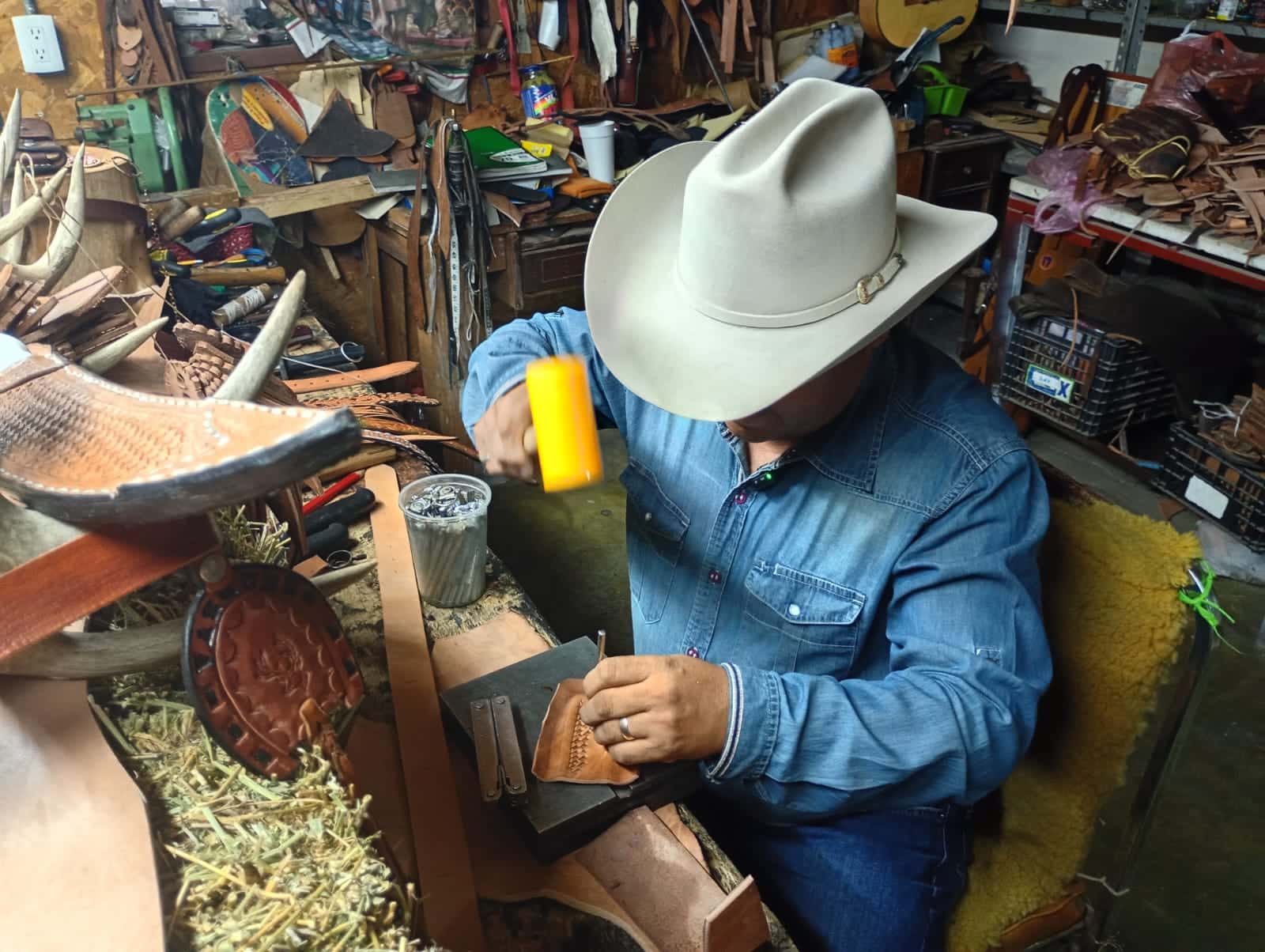Anselmo recibe a sus clientes con trato amable y amplia sonrisa; nuestro encuentro para exponer su trabajo artesanal se pactó temprano, pero él estaba listo desde antes, con el sombrero vaquero, junto a su montura en exhibición, por un lado. Listo para ponérselo para las fotografías que te compartimos.