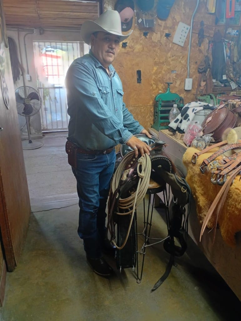 Su trabajo es apoyado y complementado por Lupita, su esposa, y por sus hijas, quienes han aprendido a coser y manejar algunas máquinas para adornar con costuras resistentes los accesorios, monturas y sillas y sillones por las que sus clientes los buscan, ¡hasta para decorar cuernos y patitas de venado!, con los que llegan en tiempo de cacería.