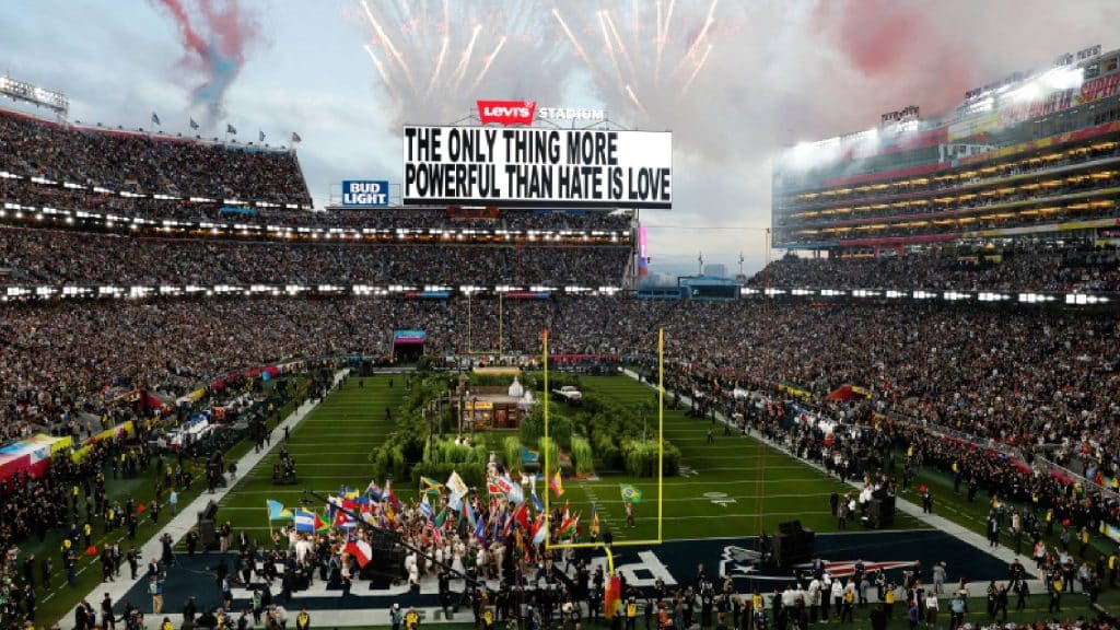 Héroes locales como Steve Young, Joe Montana y Jerry Rice estuvieron entre quienes caminaron al campo durante la canción que celebró 60 años de Super Bowls.