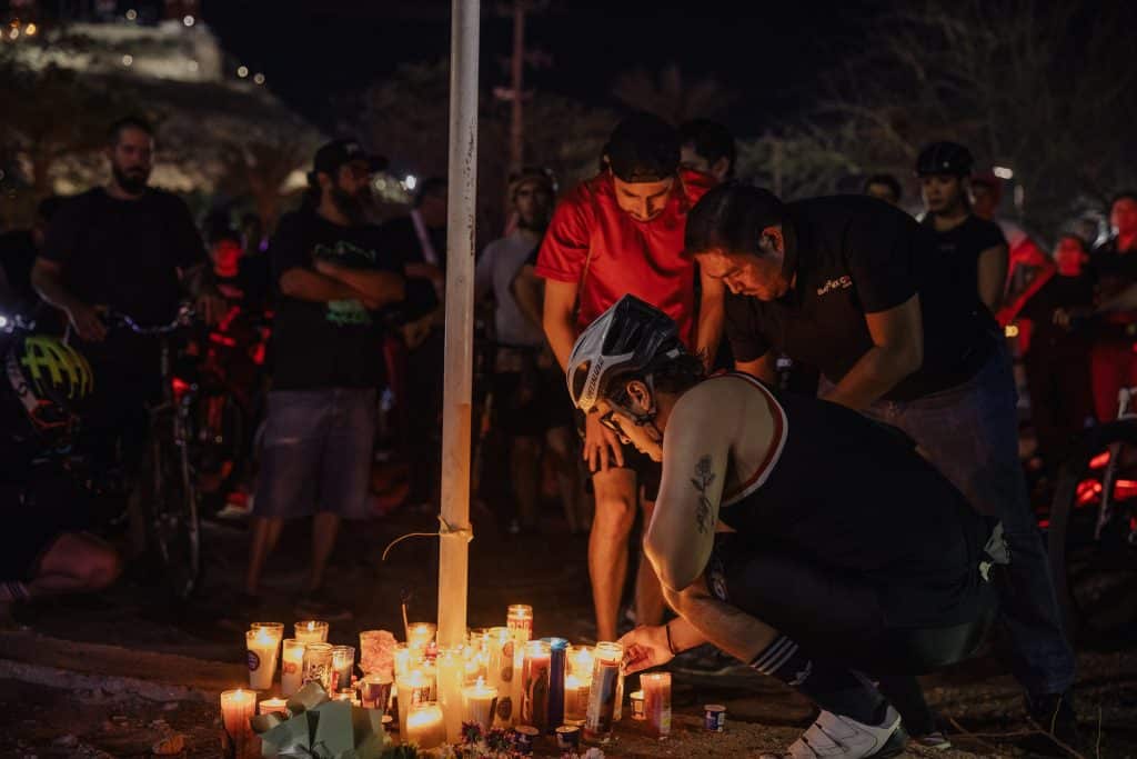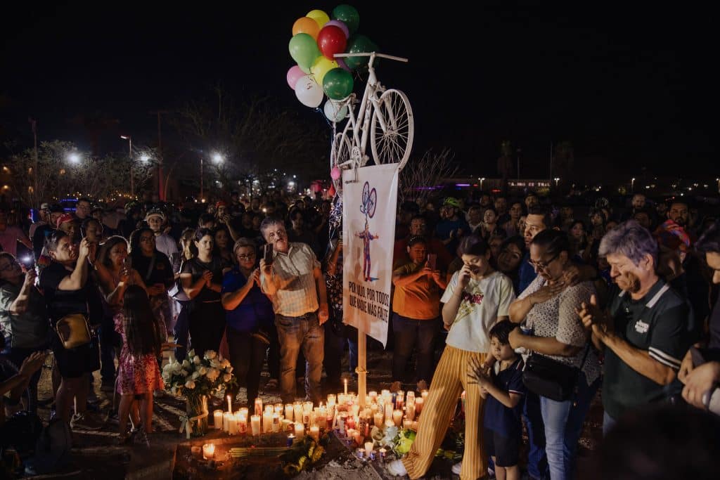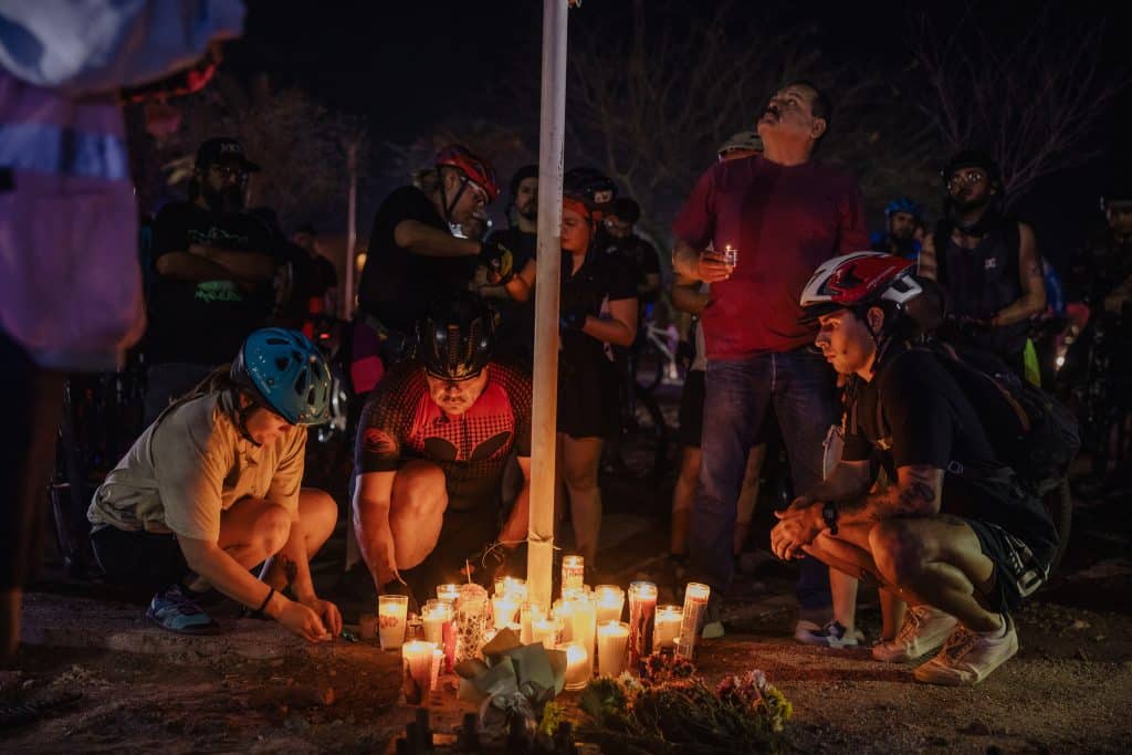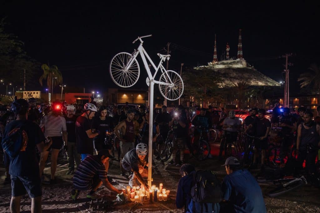 Bajo el suave parpadeo de velas y entre flores y globos, ciclistas de Hermosillo honraron a Julio César López Orduño en la glorieta de Bulevar Vildósola y Avenida de la Cultura. Las fotos muestran a familiares y amigos colocando ofrendas alrededor de la bicicleta blanca, mientras alzan la voz con consignas como “No debió morir” y “¡Justicia para Julio!”, exigiendo ciclovías seguras y respeto vial en memoria de quien se fue demasiado pronto. Fotos: Betto Robles / BikesNBeers Crew