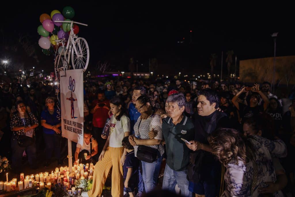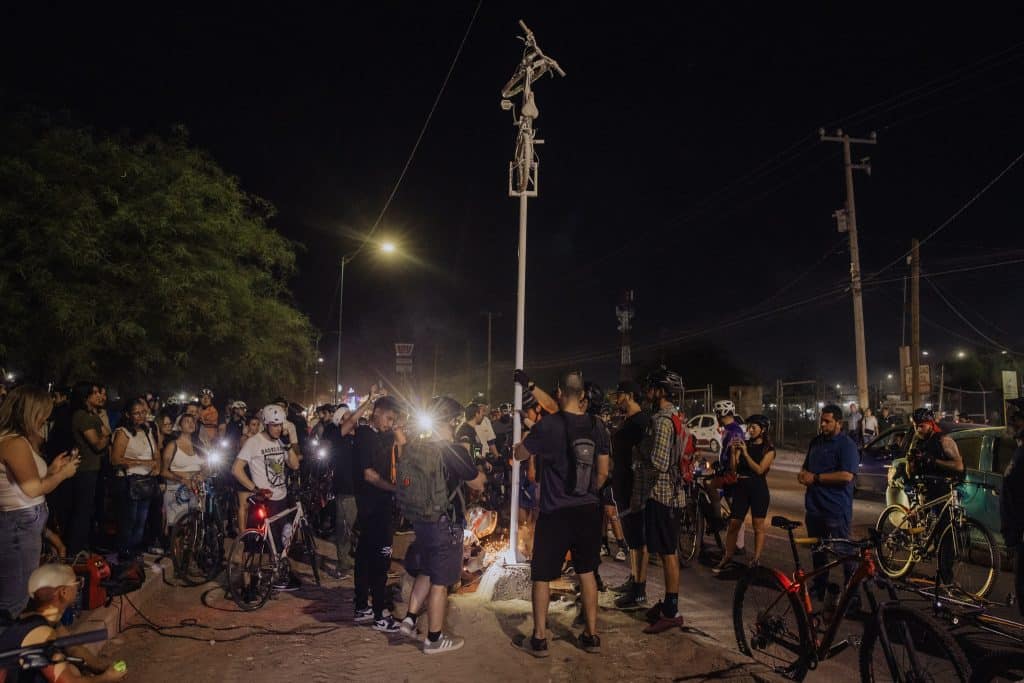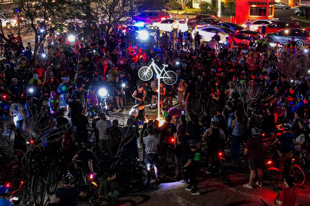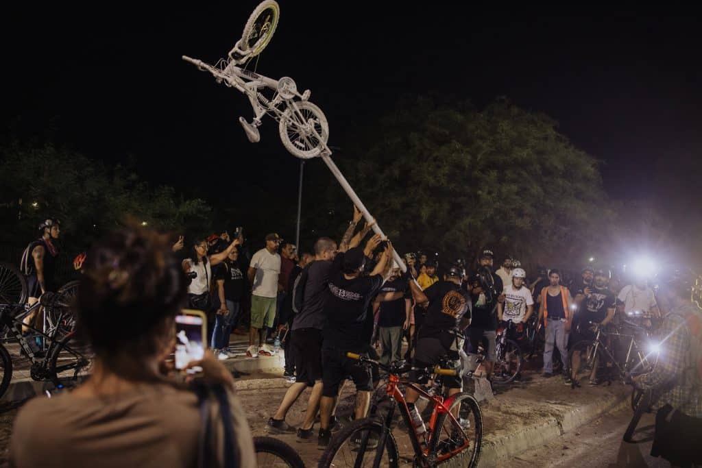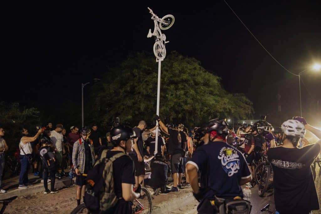 Bajo el suave parpadeo de velas y entre flores y globos, ciclistas de Hermosillo honraron a Julio César López Orduño en la glorieta de Bulevar Vildósola y Avenida de la Cultura. Las fotos muestran a familiares y amigos colocando ofrendas alrededor de la bicicleta blanca, mientras alzan la voz con consignas como “No debió morir” y “¡Justicia para Julio!”, exigiendo ciclovías seguras y respeto vial en memoria de quien se fue demasiado pronto. Fotos: Betto Robles / BikesNBeers Crew