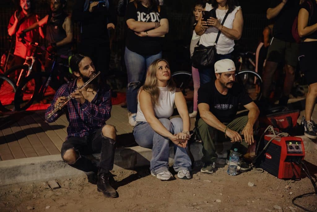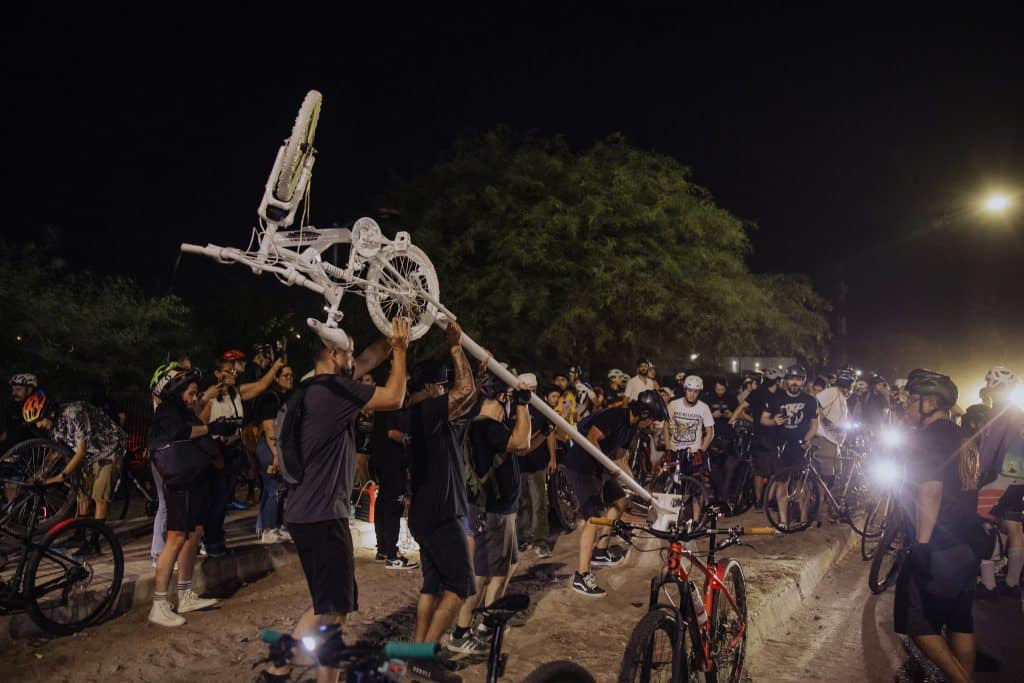 Tras el homenaje póstumo, la emoción y el coraje impulsaron a las y los ciclistas hasta las instalaciones de UNE, donde colocaron una bicicleta blanca en vertical en la entrada y salida. Su posición evoca los malabares que Julio hacía al sostenerla sobre su cabeza, recordando cada día a los conductores de transporte público la injusta pérdida y la responsabilidad al volante. Fotos: Betto Robles / BikesNBeers Crew