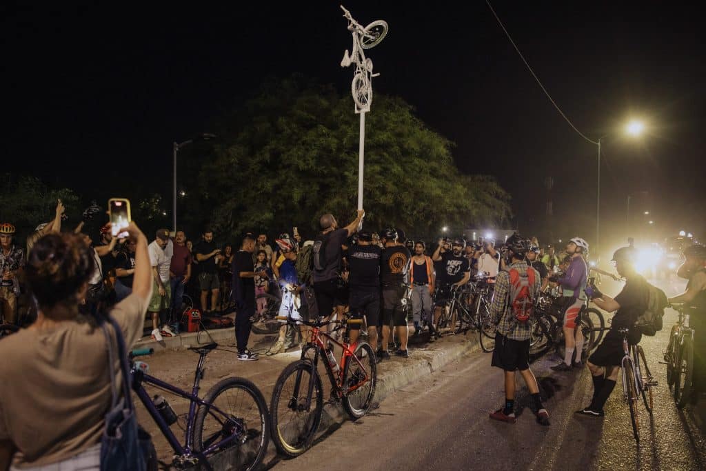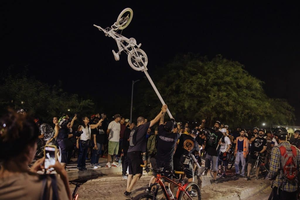 Al terminar este homenaje póstumo, la tristeza, el dolor y el coraje dio fuerza a las piernas de las y los ciclistas, quienes se dirigieron a las instalaciones de UNE, donde se guardan los camiones del transporte urbano, para colocar en la entrada y salida una bicicleta fantasma, una bicicleta blanca que recuerde la injusta muerte de su compañero y cree conciencia de la responsabilidad de los conductores.