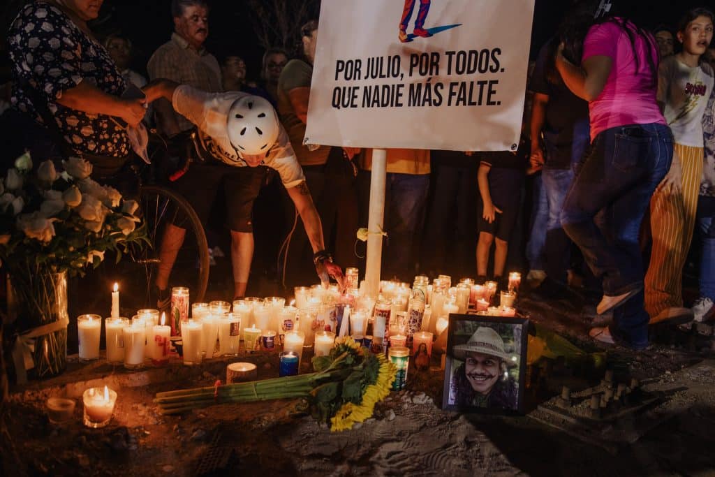 Junto a su familia, los bikers colocaron flores, globos y velas en la glorieta del Bulevar Vildósola y Avenida de la Cultura, a donde llegaron pedaleando desde la Plaza de los 100 años; el sitio de destino es un memorial en honor a los ciclistas que han perdido la vida. En el punto donde se encuentra la bicicleta blanca, se alzó el grito “No debió morir” y “¡Justicia para Julio!”.