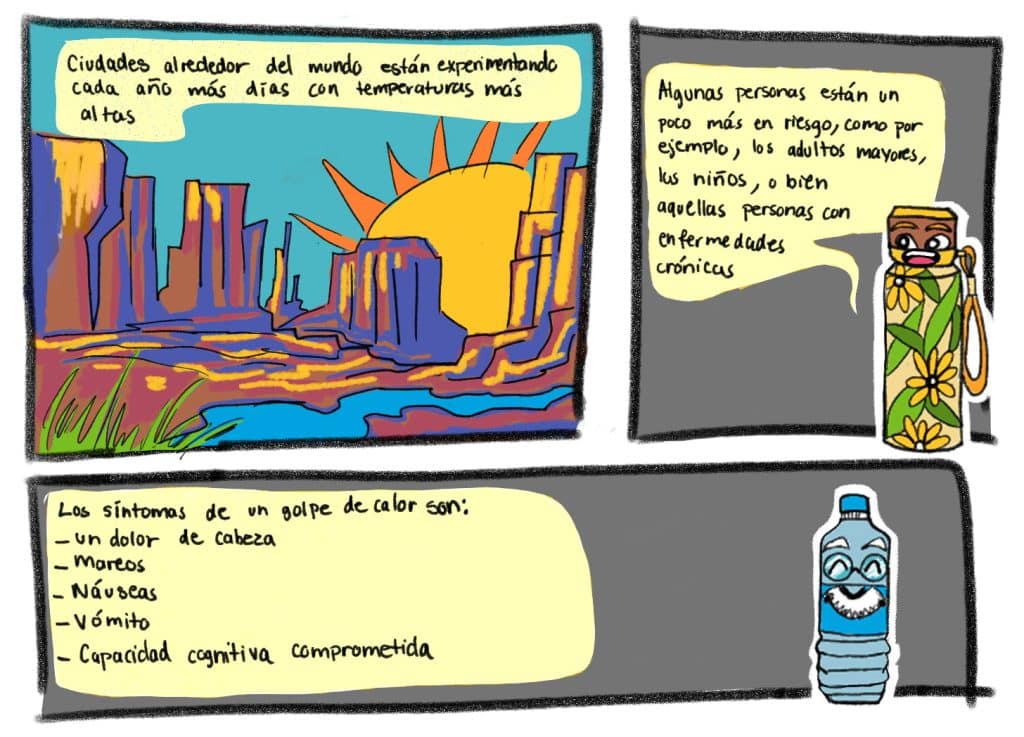 Maricarmen Vizcaino: Es importante tomar agua fresca antes de salir de casa y durante el día, usar protector solar, usar ropa clara. Tratar de evitar las horas durante el día que está el calor más fuerte—a veces no es posible por la naturaleza de nuestro trabajo o por las actividades que tenemos que realizar, pero si podemos evitarlo, eso puede ayudarnos. También podemos estar conscientes de quiénes cercanos a nosotros están en mayor riesgo. Hablando como comunidad, es importante que vecinos cuiden de vecinos, conocidos de conocidos, especialmente los adultos mayores y personas con enfermedades crónicas. ¿Estás bien? ¿Necesitas agua, tu aire acondicionado está funcionando? Es muy importante que mantengamos esos lazos de comunidad ahorita cuando estamos sufriendo este cambio climático.