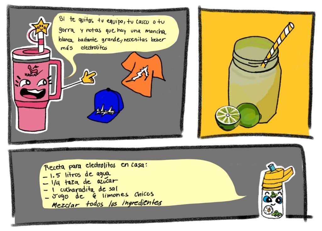 Maricarmen Vizcaino: Mucha gente ha experimentado cuando sudamos que tenemos manchas blancas en la ropa, especialmente si estamos utilizando colores oscuros. Esas manchas blancas son todas las sales y los minerales que nuestro cuerpo está perdiendo cuando sudamos. Entonces, no es no más el agua que necesitamos reponer, sino también esas sales y minerales. Por lo tanto, es importante tomar electrolitos. Hay maneras de tomar electrolitos haciendo una solución en casa. No es recomendable estar tomando bebidas deportivas, que son comunes, porque usualmente esas bebidas tienen un alto contenido calórico y, sobre todo, mucha azúcar, lo cual no es bueno para la salud, pero especialmente no es bueno para aquellos que sufren de enfermedades crónicas como la diabetes, por ejemplo, o aquellos que están tratando de combatir la obesidad o el sobrepeso. Lo más importante es reponer esos electrolitos, entonces podemos hacer una solución en casa con sal, azúcar, agua y un jugo cítrico como el limón, por ejemplo.