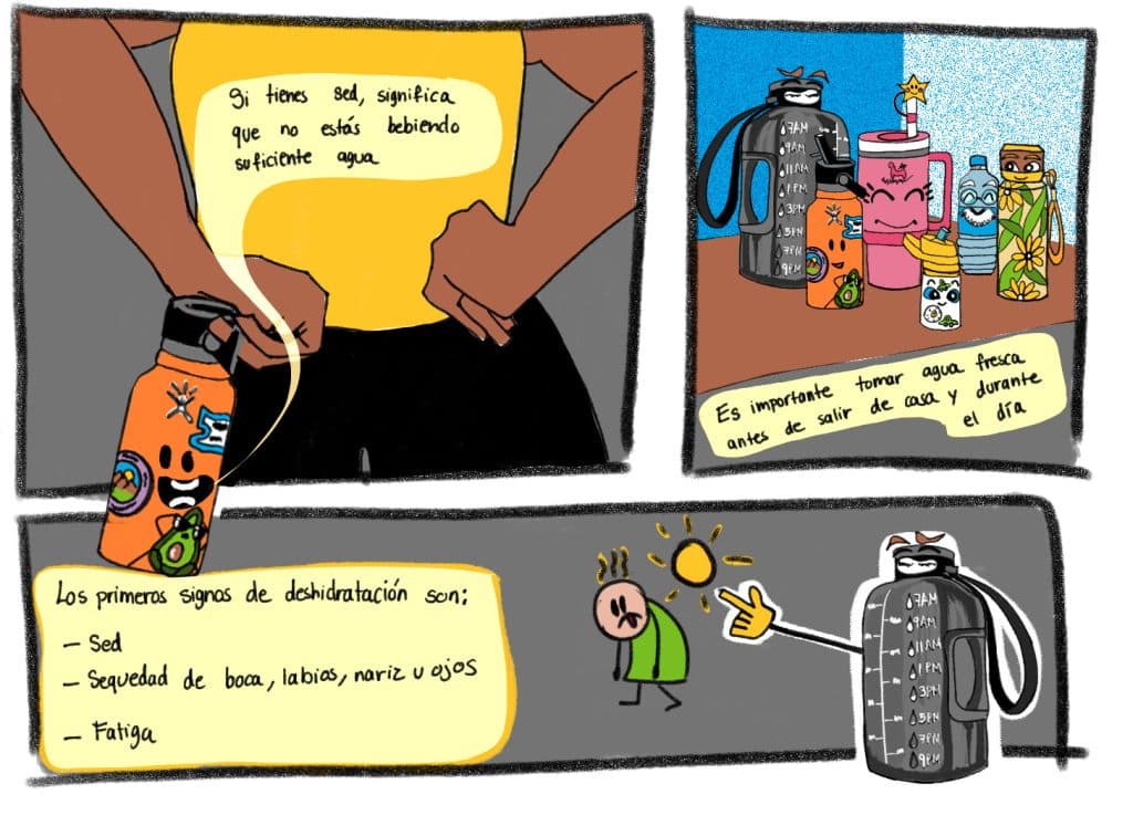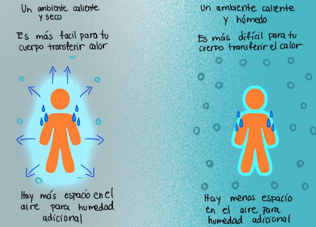 Maricarmen Vizcaino: Cuando sudas y tu piel está húmeda, eso hace que el calor se disipe de tu cuerpo—salga, por así decirlo. Una de las partes cruciales en las cuales se disipa gran parte de nuestro calor es la cabeza. Poner agua en la cabeza es una buena manera de poder disipar ese calor en nuestro cuerpo. También es importante saber todas aquellas cosas que nos deshidratan. Altas cantidades de cafeína pueden deshidratarnos, el consumo de alcohol puede deshidratarnos.