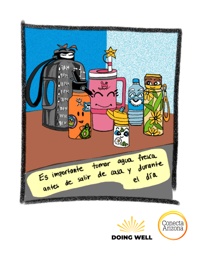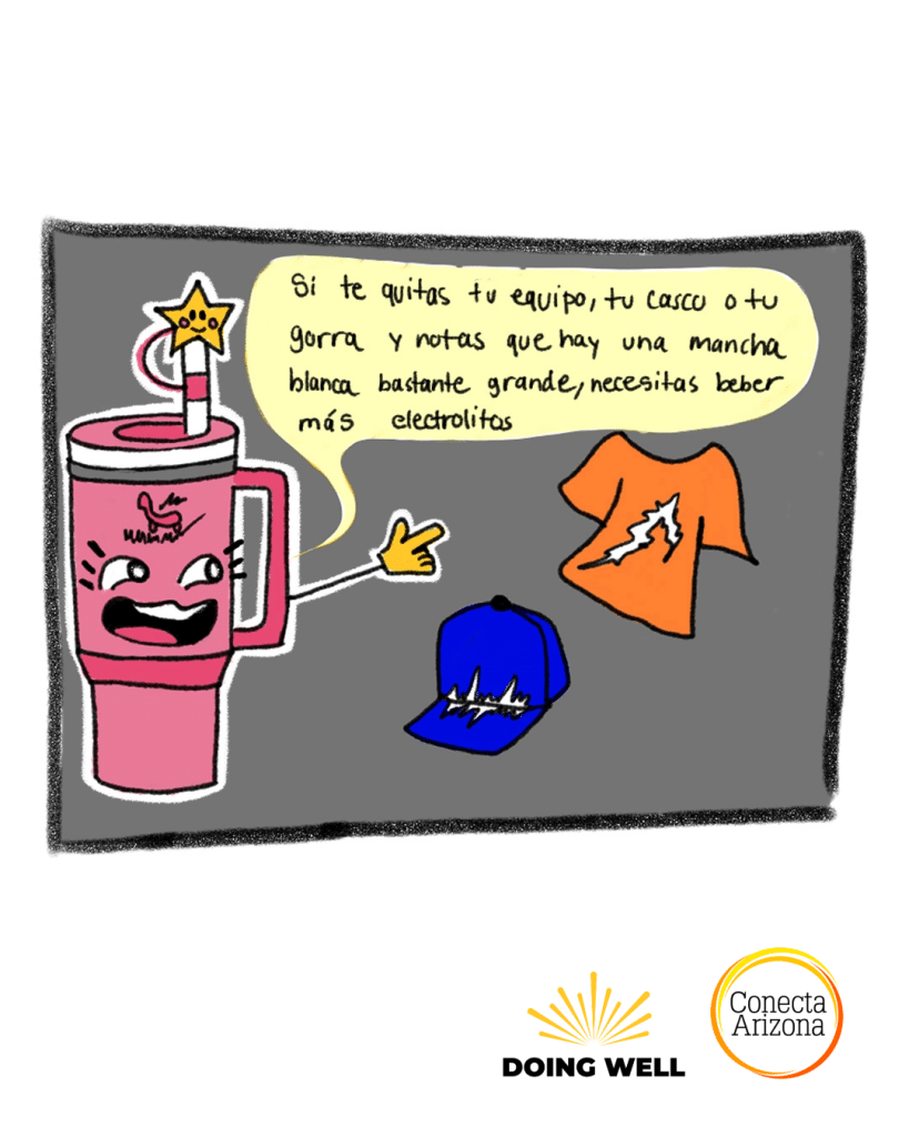 “El agotamiento por calor sería la primera fase, cuando empezamos a tener mucha fatiga, dolor de cabeza, probablemente náuseas. Nuestro cuerpo está batallando para regular la temperatura interna. Debemos tomar agua fresca, movernos del lugar donde está haciendo mucho calor y si estamos en el sol ponemos en la sombra. Si llegamos al punto en el que hay confusión mental o desmayo, si la persona empieza, por ejemplo, a decir cosas que no tienen sentido o si está confusa con respecto a dónde está, quiere decir que el calor ya está afectando el sistema neurológico y puede ser un golpe de calor. Inmediatamente tienen que tomarse medidas extremas: sumergir a la persona en una bañera con agua fresca, llevarla a Emergencias o llamar al 911, porque pueden ocurrir daños irreversibles a los órganos o incluso la muerte”, explicó Vizcaino en el programa de radio La Hora del Cafecito, de Conecta Arizona, como parte de la colaboración con Doing Well de ASU para publicar contenido periodístico sobre salud en español.