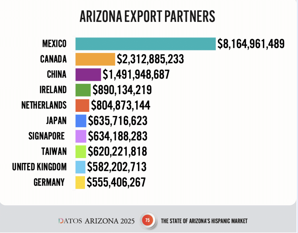 El martes 30 de septiembre se efectuó en el acostumbrado desayuno en el Symphony Hall en el centro de Phoenix el lanzamiento del reporte anual de la Cámara Hispana de Comercio de Arizona, DATOS, en su edición 29. En el mencionado informe, se revisa a profundidad este aspecto en el apartado de “Oportunidad Económica”, en un artículo escrito por Sonary Amachree en el que se menciona que Arizona es uno de los estados más afectados dado que la mayor cantidad de importaciones vienen de México.