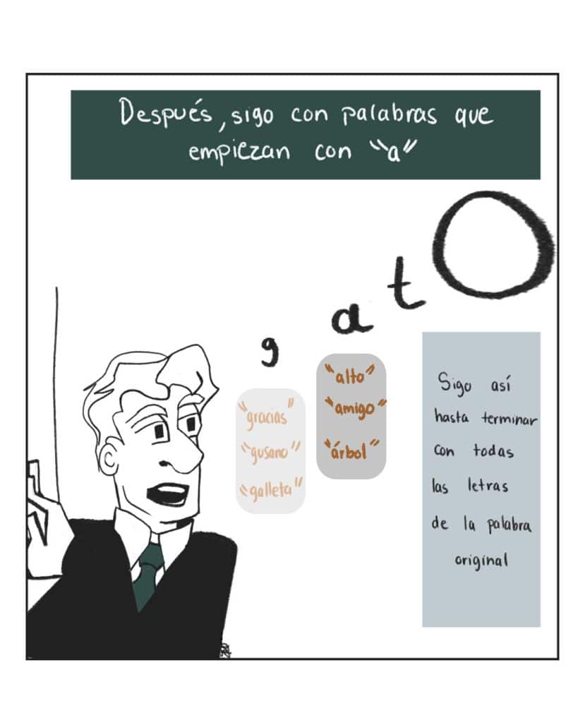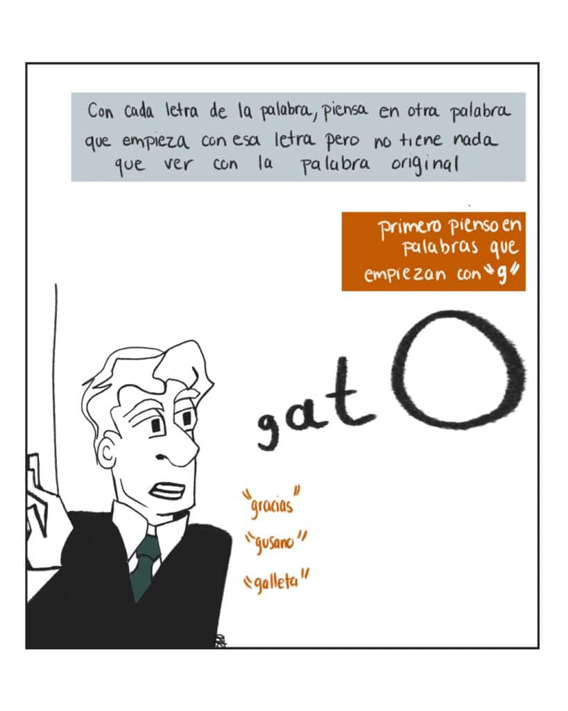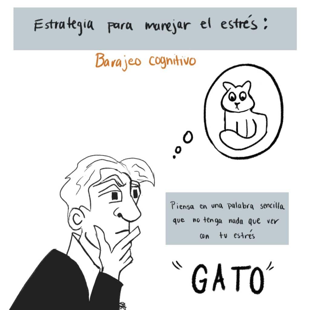 - Barajeo cognitivo: Piensa en una palabra sencilla que no tenga nada que ver con tu estrés. Con cada letra de la palabra, piensa en otra palabra que empieza con esa letra, pero no tiene nada que ver con la palabra original. Por ejemplo, si mi palabra original es “gato”, primero pienso en palabras que empiezan con “g”: “gracias”, “gusano”, “galleta”. Después, sigo con palabras que empiezan con “a”: “alto”, “amigo”, “árbol”. Sigo así hasta terminar con todas las letras de la palabra original. Es otra estrategia para distraer nuestra atención de pensamientos catastróficos. A veces solo necesitamos unos minutos para respirar y volver a centrarnos.