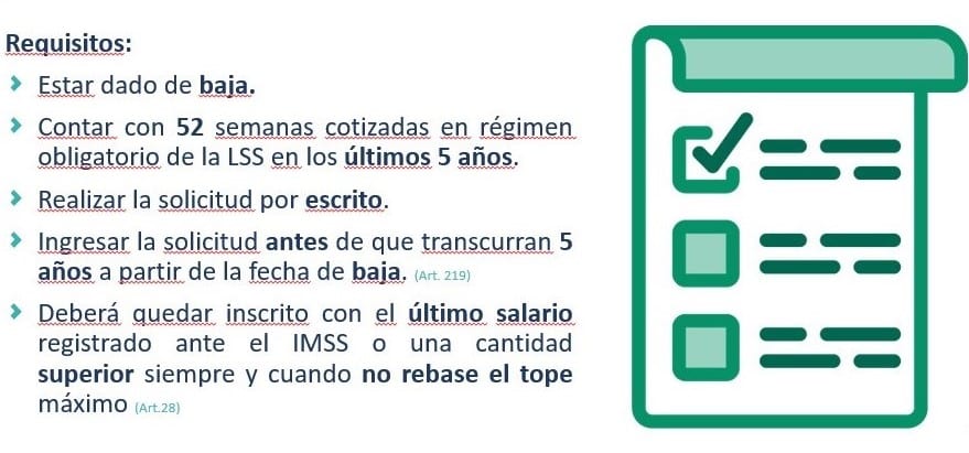 🗨️ “Los requisitos para adherirse a la Modalidad 40 son estar dado de baja, contar con 52 semanas cotizadas en régimen obligatorio de la LSS en los últimos 5 años, realizar la solicitud por escrito, ingresar la solicitud antes de que transcurran 5 años a partir de la fecha de baja (artículo 219); deberá quedar inscrito con el último salario registrado ante el IMSS o una cantidad superior siempre y cuando no rebase el tope máximo (artículo 28)”.