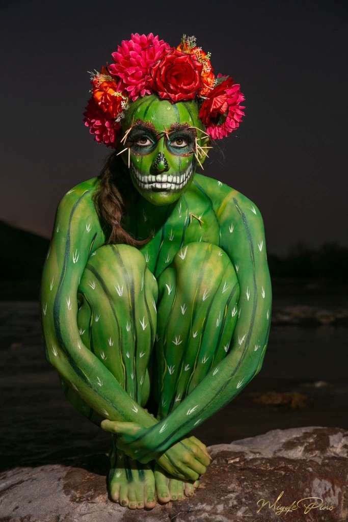 En este año se dio a la tarea de no sólo recorrer campos de cempasúchil y mano pantera, las flores tradicionales de muertos, sino también espacios donde la flora desértica se impone y plasmar en su trabajo un estilo de Catrina sonorense, cuya modelo fue pintada a detalle por Maritza Peralta, artista del body paint, con quien ha trabajado también la famosa Catrina Buchona de hace algunos años y los también conocidos alebrijes, a los cuales se les ha dado sitio.