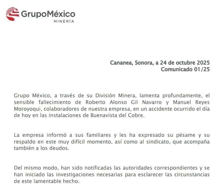 Grupo México, propiedad de la empresa minera, informó sobre el accidente que ocurrió la tarde del viernes, en el que también resultó herida una tercera persona.