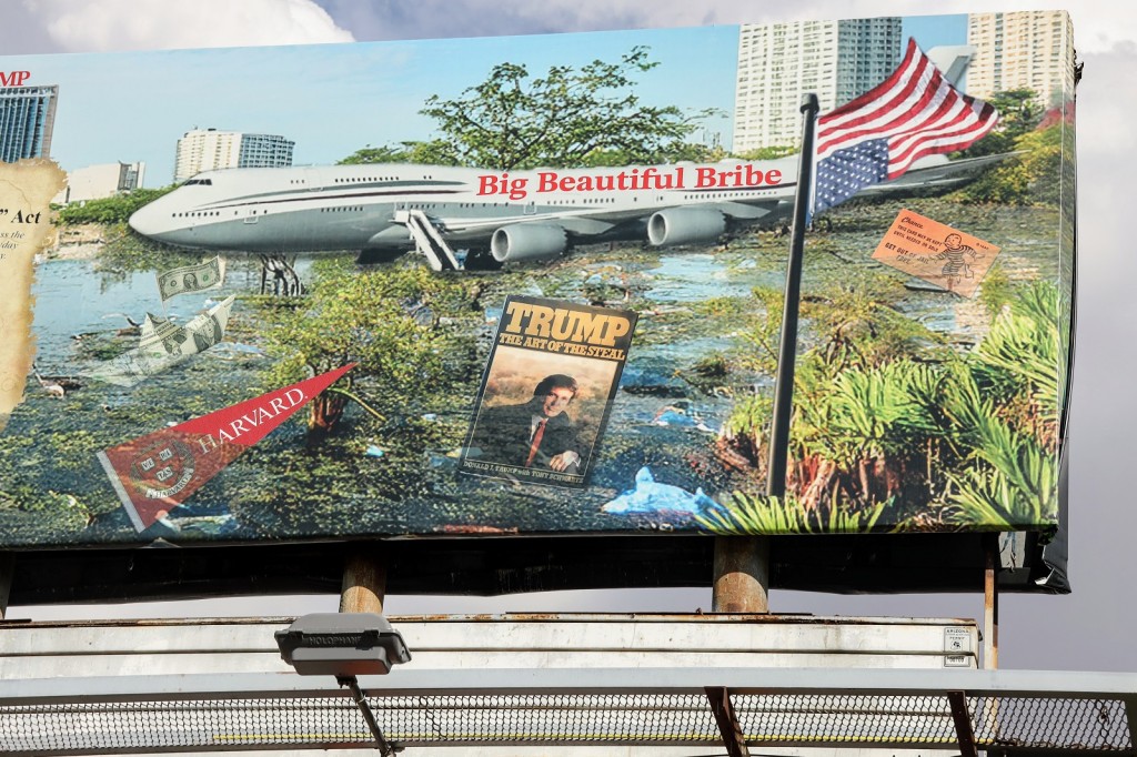 A su alrededor: un caimán con gorra MAGA, una Cybertruck grafiteada con una esvástica roja, una explosión nuclear en el horizonte, una bandera estadounidense hundida en el fango junto a un avión con la frase “Big Beautiful Bribe” (“La gran y hermosa mordida”), parodia directa del lenguaje característico del presidente. El paisaje incluye también basura, una insignia de Harvard, dólares flotantes, libros como The Art of the Steal (juego de palabras con The Art of the Deal), y un ticket de “Get out of jail free”, alusión directa a la impunidad.