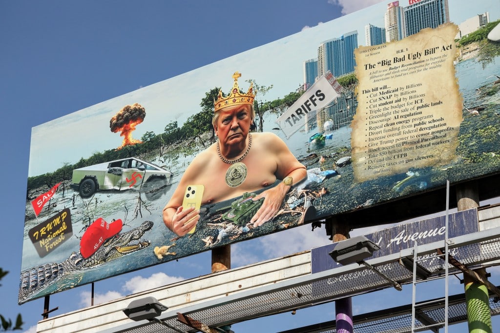 El Billboard, imposible de ignorar, no sólo captura miradas: las reta. Con una composición visual que roza el exceso sin perder precisión, la imagen muestra al presidente Donald Trump en el centro de la escena: coronado, con el torso desnudo, hundido en un pantano. En su mano derecha, un celular dorado estilo selfie; en la izquierda, un diminuto tanque verde. Al cuello, un medallón dorado que evoca más a la mafia que a la realeza.