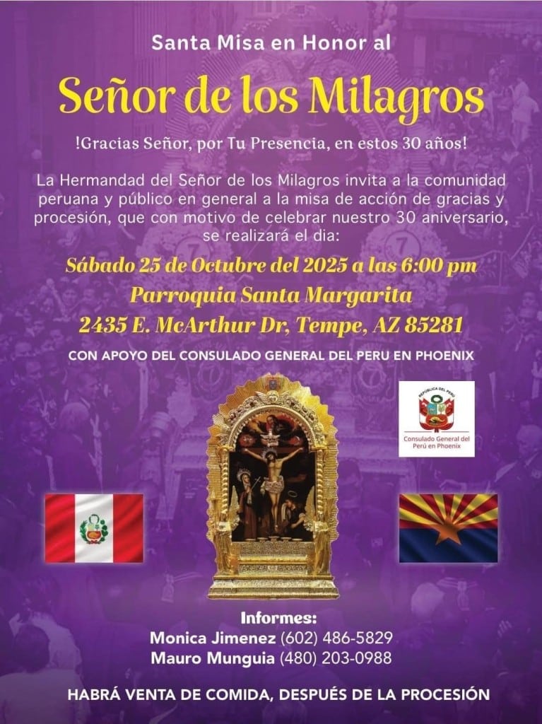 Como todos los años, se espera la concurrencia de los fieles y devotos de la comunidad peruana y otros residentes en Arizona y estados cercanos, para unirse y celebrar con profundo fervor esta tradición religiosa.