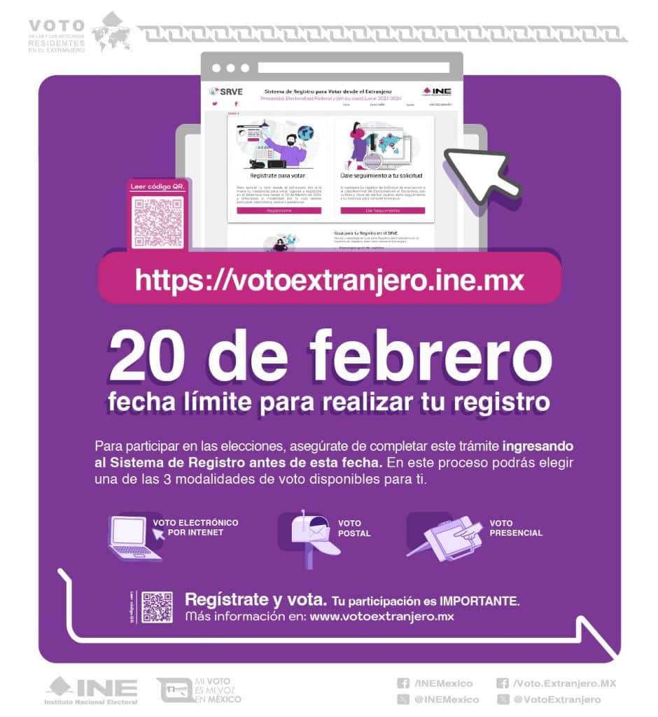 El 20 de febrero es la fecha límite para registrarse desde el extranjero para votar en las elecciones que se realizarán en México el 2 de junio, en la que se votarán por más de 20,000 cargos en todo el país, desde Presidenta de la República hasta gobernadores en algunos estados y legisladores federales y estatales. Hasta el 20 de febrero se puede renovar la credencial de elector si se encuentra vencida, ya que sin ella no se podrá ejercer el derecho al voto. Los mexicanos que residen en el extranjero podrán votar de tres maneras: en forma presencial en alguno de los 23 Consulados habilitados en Estados Unidos (Phoenix, en Arizona, es uno de ellos), Canadá, España y Francia, a través de correo postal o mediante internet (voto electrónico).