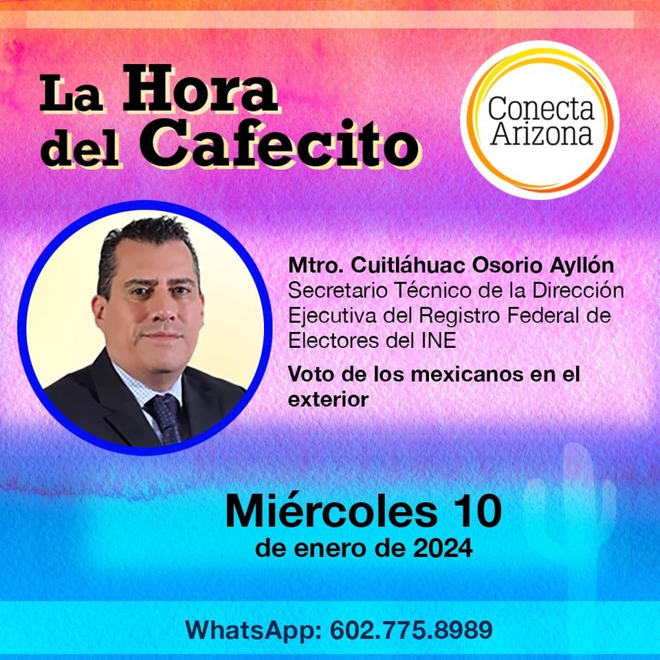 Así lo explicaron representantes del Instituto Nacional Electoral (INE) de México en diálogo con nuestra comunidad sobre las elecciones presidenciales y el voto de los mexicanos residentes en el extranjero. Cuitláhuac Osorio (secretario técnico de la Dirección Ejecutiva del Registro Federal de Electores), Claudia Corona (subdirectora de Vinculación Electoral de Mexicanos Residentes en el Extranjero) y Raúl Cruz (líder de proyecto de Estudios y Enlace) respondieron preguntas (🗨️) de los integrantes de La Hora del Cafecito☕ en WhatsApp, muchos de ellos mexicanos residentes en Arizona.
