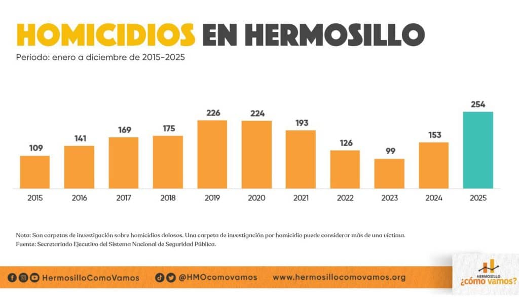 Sobre este tema, en la misma semana, la organización Hermosillo, ¿cómo vamos?, dio a conocer que, en 2025, la capital de Sonora ha sido la ciudad con más homicidios desde que se tiene registro.