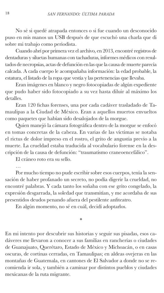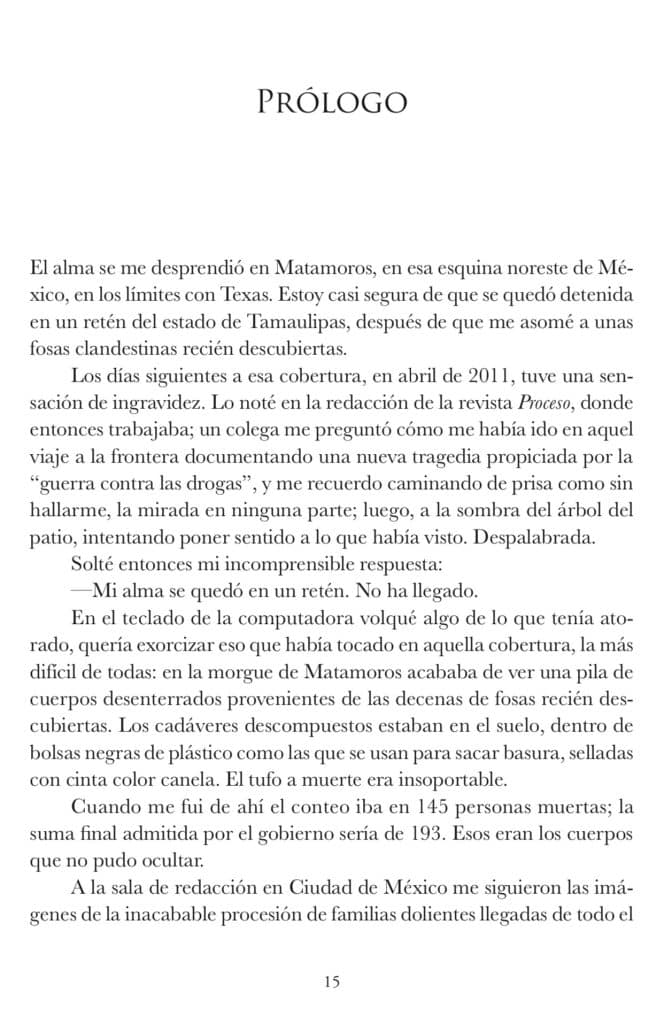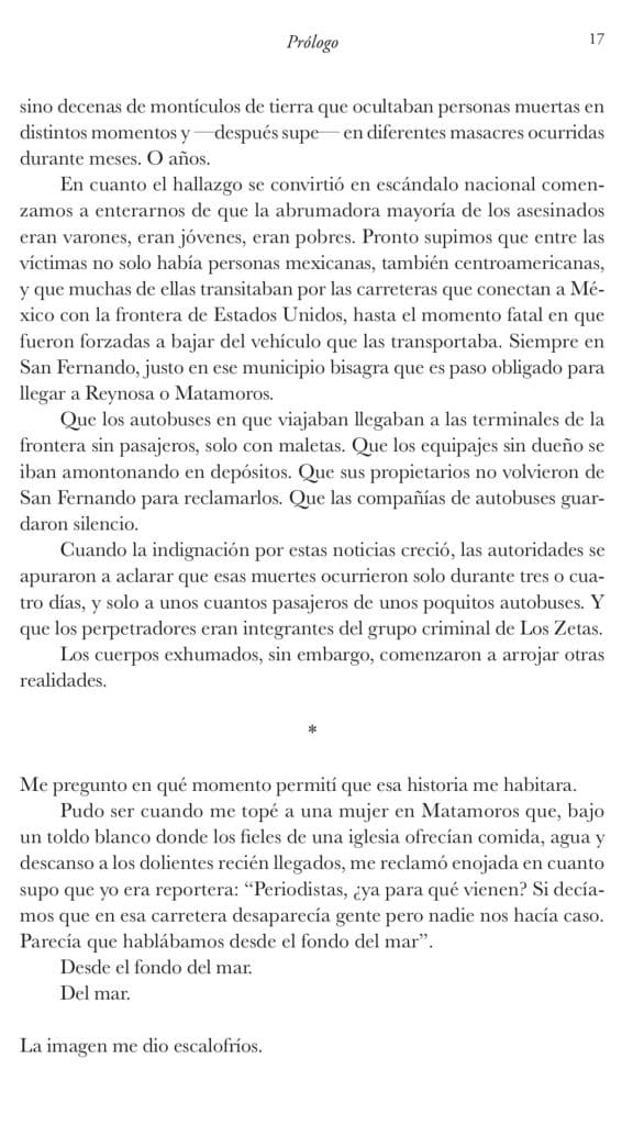 “El alma se me desprendió en Matamoros”. Así inicia el nuevo libro de la destacada periodista investigativa mexicana Marcela Turati. A través de testimonios, nos relata en sus primeras páginas la travesía de un autobús que salió de Uruapan, Michoacán, el 23 de marzo de 2011, rumbo a la frontera con los Estados Unidos. En él, viajaban varias personas en busca de una vida mejor en el país del norte. Al llegar a San Fernando, Tamaulipas, 12 pasajeros fueron bajados del autobús, privados de su libertad por hombres armados. Ante la confusión de choferes, testigos y el resto de los pasajeros, el autobús siguió su camino por la carretera federal 101, sin que a nadie se le advirtiera lo que estaba sucediendo en la parada de San Fernando. Los autobuses no dejaron de circular por la misma ruta y, a la central de autobuses de Reynosa, Tamaulipas, llegaron maletas sin dueño, y nadie las reclamó.