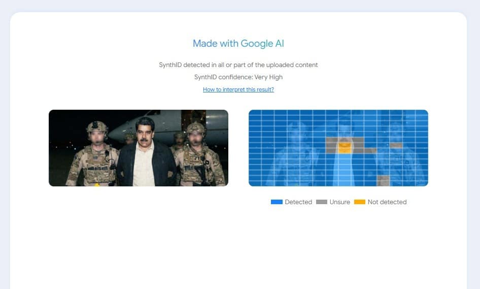 El medio mexicano además indica que pudieron confirmar “con un alto grado de certeza, la presencia de la marca de agua invisible SynthID. Esta marca es insertada por Google en las imágenes que genera con herramientas de inteligencia artificial. Esto descarta que se trate de una foto auténtica y sugiere que fue creada específicamente con alguna herramienta de IA de Google, como Gemini”.