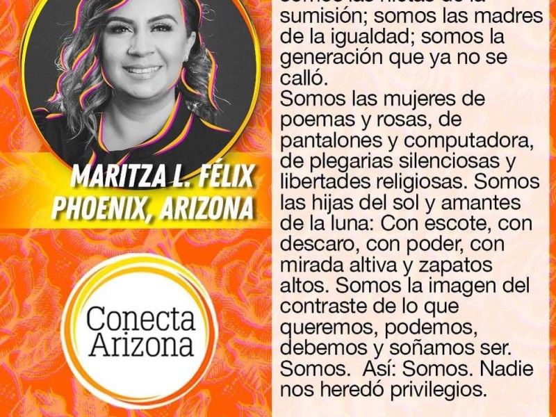Además, hoy es una oportunidad para pensar a la mujer hispana y migrante en Arizona (y en Estados Unidos en general): sus logros personales y profesionales, sus desafíos y luchas, su carácter emprendedor y su rol en la familia y la comunidad latina. En Conecta Arizona estamos trabajando en historias inspiradoras de mujeres hispanas de Arizona para compartir durante todo este mes: puedes leer el primer testimonio aquí.
