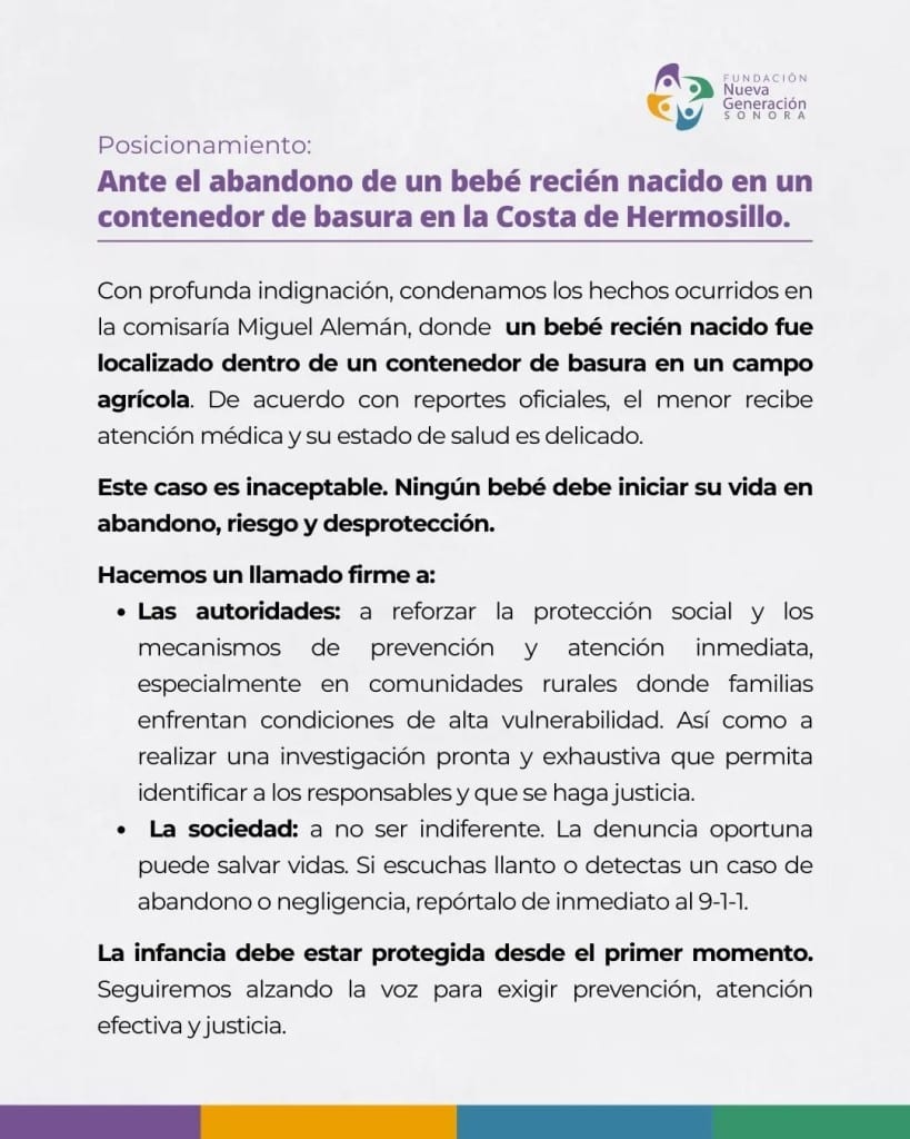 Fundación Nueva Generación reprueba abandono de bebé en un contenedor de basura en la Costa de Hermosillo