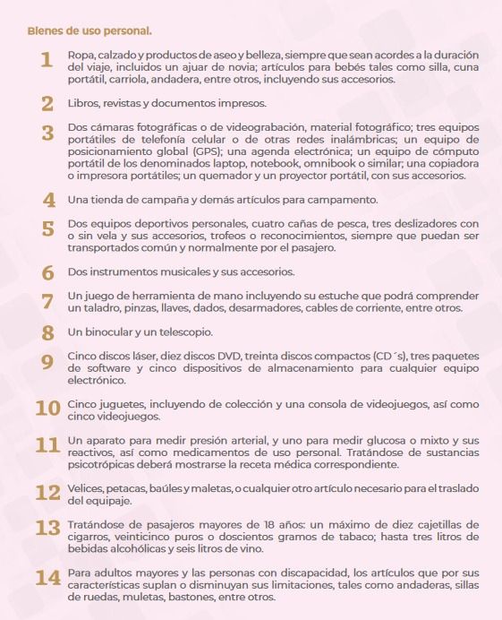 “Hay muchos detalles, por lo que les recomiendo que vean la Guía Héroes Paisanos, porque son demasiados tipos de objetos los que pueden contar como equipaje personal y por lo tanto no son contados en la franquicia. Esa franquicia son mercancías adicionales al equipaje personal. ¿Qué es el equipaje personal? Ropa, calzado, productos de aseo, belleza, sean nuevos o usados, se consideran parte del equipaje personal, siempre que sea acorde con la duración del viaje. Por supuesto que si voy tres semanas (a México) pero llevo tres maletas de ropa, probablemente no hay una consistencia, probablemente haya mercancías. Igual con los libros, revistas, inclusive cámaras fotográficas pueden ser consideradas; equipos de celulares también se pueden considerar como bienes de uso personal y no van a ser incluidos en la franquicia. En la Guía Héroes Paisanos está la descripción específica de cuáles son los objetos que se consideran parte de uso personal o de equipaje personal y que por lo tanto no son incluidos en esta franquicia”.
