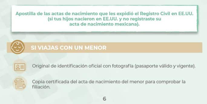 “No, en ese caso no sería necesario que tengan un pasaporte pero sí que tengan su acta de nacimiento, de preferencia la certificada. Cuando se hace el registro se les entrega el comprobante, hay gente que ya se queda con una o dos copias certificadas más, es decir no una simple copia sino una copia certificada, que es la que se da en las oficinas. Con eso sería suficiente en el caso de los hijos. Muy importante también para quienes viajan con hijos menores: quienes crucen con hijos o hijas menores de edad tienen que llevar siempre, independientemente que sea doble ciudadanía (si es un hijo estadounidense, si es un hijo mexicano), un acta de nacimiento de la persona menor para poder comprobar que ese hijo o hija es nuestro hijo o hija, y en el documento o acta de nacimiento donde aparece el nombre de los padres se pueden identificar. Como vivimos en la frontera y estamos tan familiarizados, se nos olvida que estamos cruzando una frontera internacional. Tenemos que ser muy cuidadosos porque sabemos que existe el robo de infantes y todos tenemos que ayudar a prevenirlo. Entonces, hay que llevar el acta de nacimiento de nuestros hijos menores siempre que salgan, con lo cual la madre o el padre puede comprobar que es su hijo. A cualquier lugar que viajen, siempre lleven copia certificada del acta de nacimiento y con eso no va a haber mayor problema. Si no tienen otro documento mexicano, no hay problema, pero tengan su copia certificada de acta de nacimiento”.
