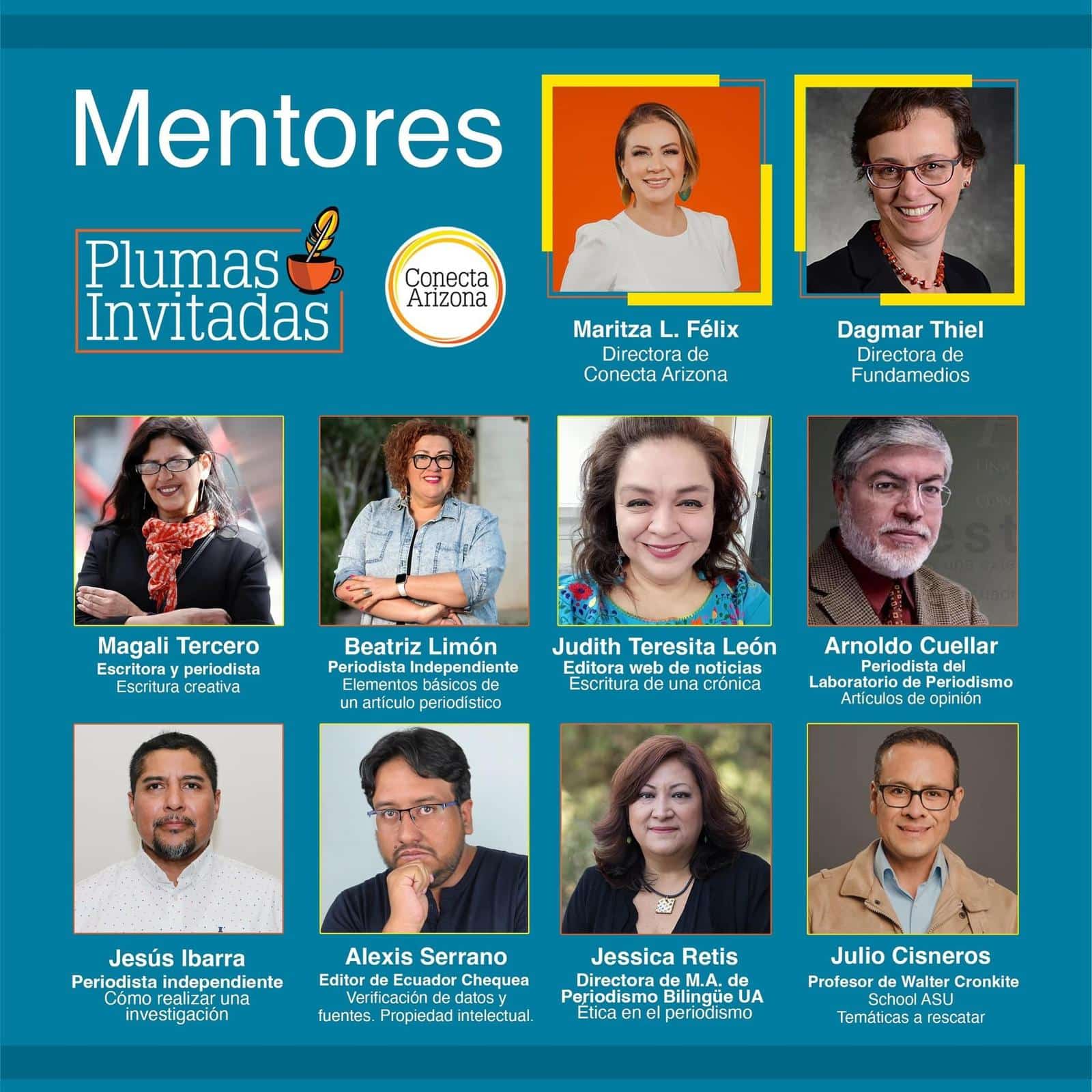 Plumas Invitadas es dirigida por Maritza L. Félix, directora y fundadora de Conecta Arizona, y por Dagmar Thiel, directora de Fundamedios y coordinadora de este programa de capacitación comunitaria. Sus mentores son periodistas y académicos de Arizona, México, Perú, Guatemala y Ecuador, con experiencia y trayectoria internacional: Magali Tercero, Beatriz Limón, Judith Teresita León, Arnoldo Cuéllar, Jesús Ibarra, Alexis Serrano, Jessica Retis y Julio Cisneros.