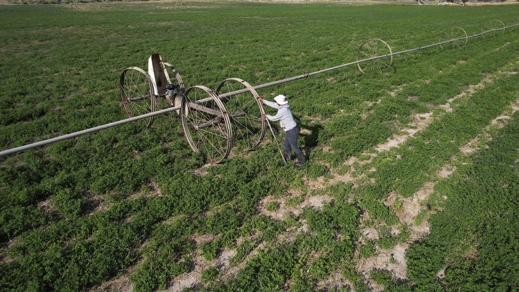 Un trabajador inmigrante riega un campo en el Baker Ranch el lunes 9 de septiembre de 2024, en Baker, Nevada. (Foto AP/Rick Bowmer/Archivo)