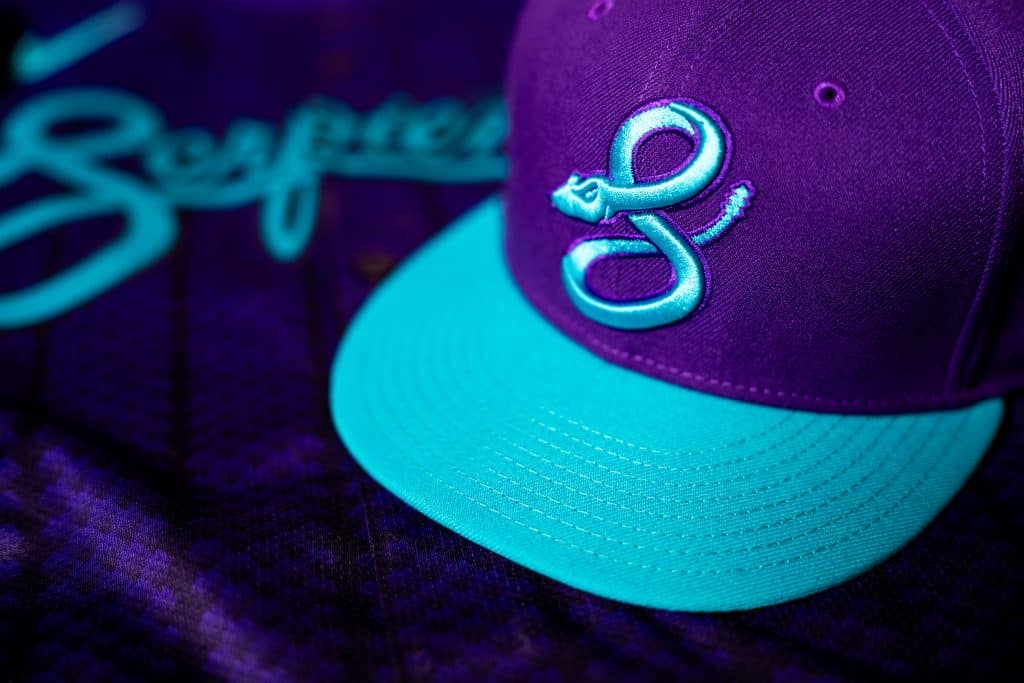 - La gorra: El logo “S” debuta en el campo y destaca con la clásica combinación púrpura y verde azulado.