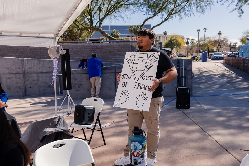 Organizados en mesas, bajo carpas de color blanco, los asistentes a esta concentración discutieron sobre la necesidad de que se reduzcan los alquileres para que lo arizonenses puedan permanecer en sus casas, destacando que la cantidad de desalojos en el Condado de Maricopa es histórico.