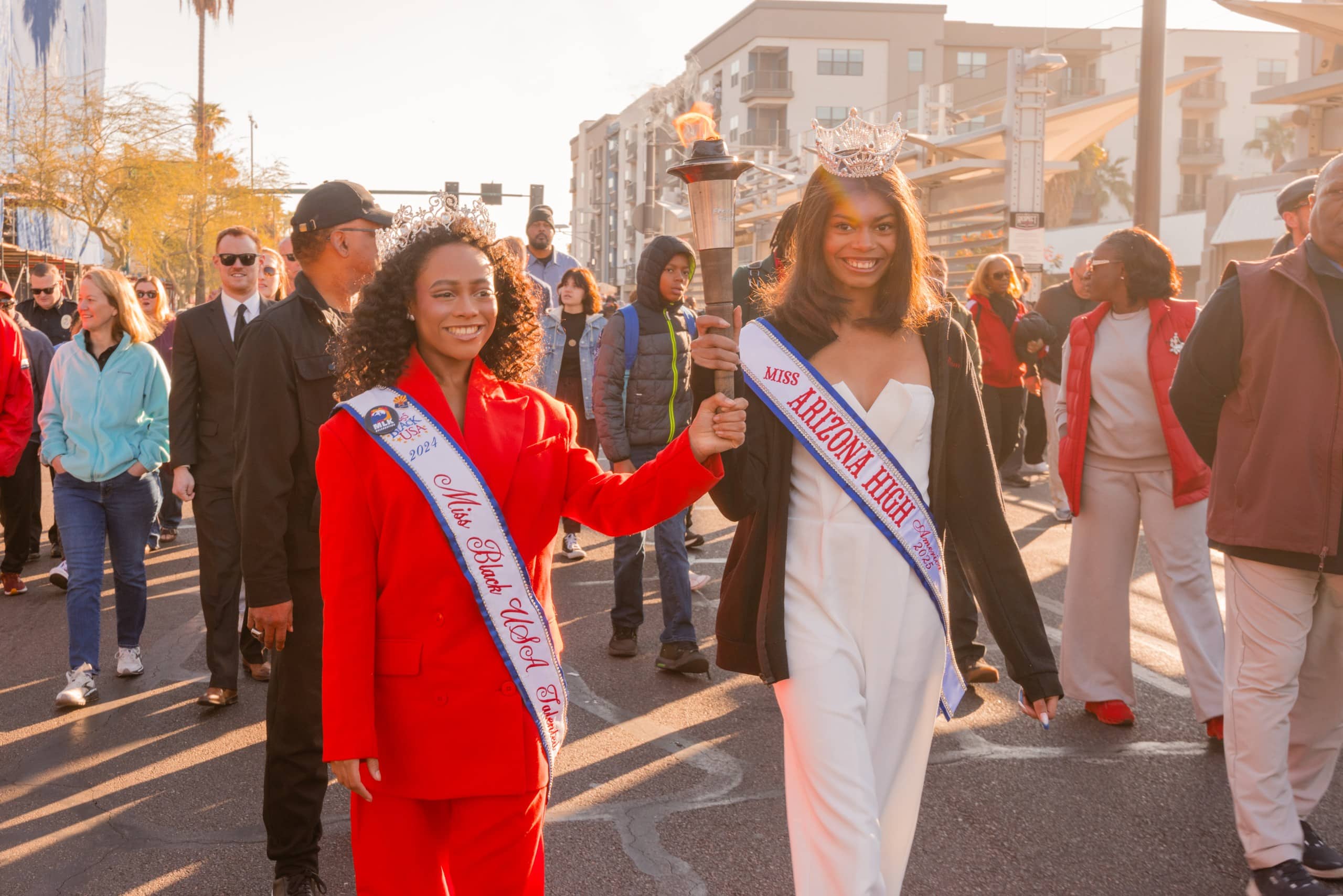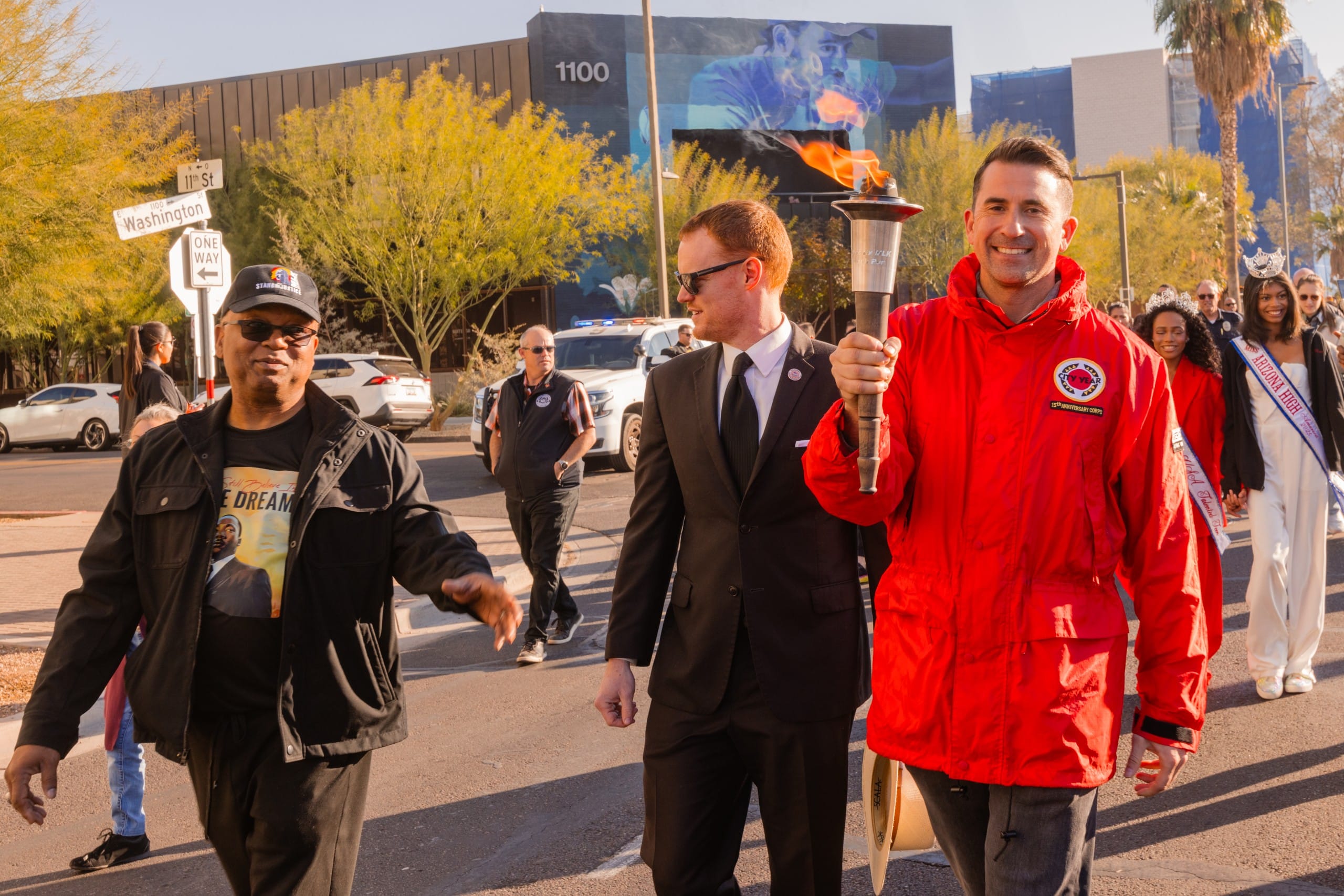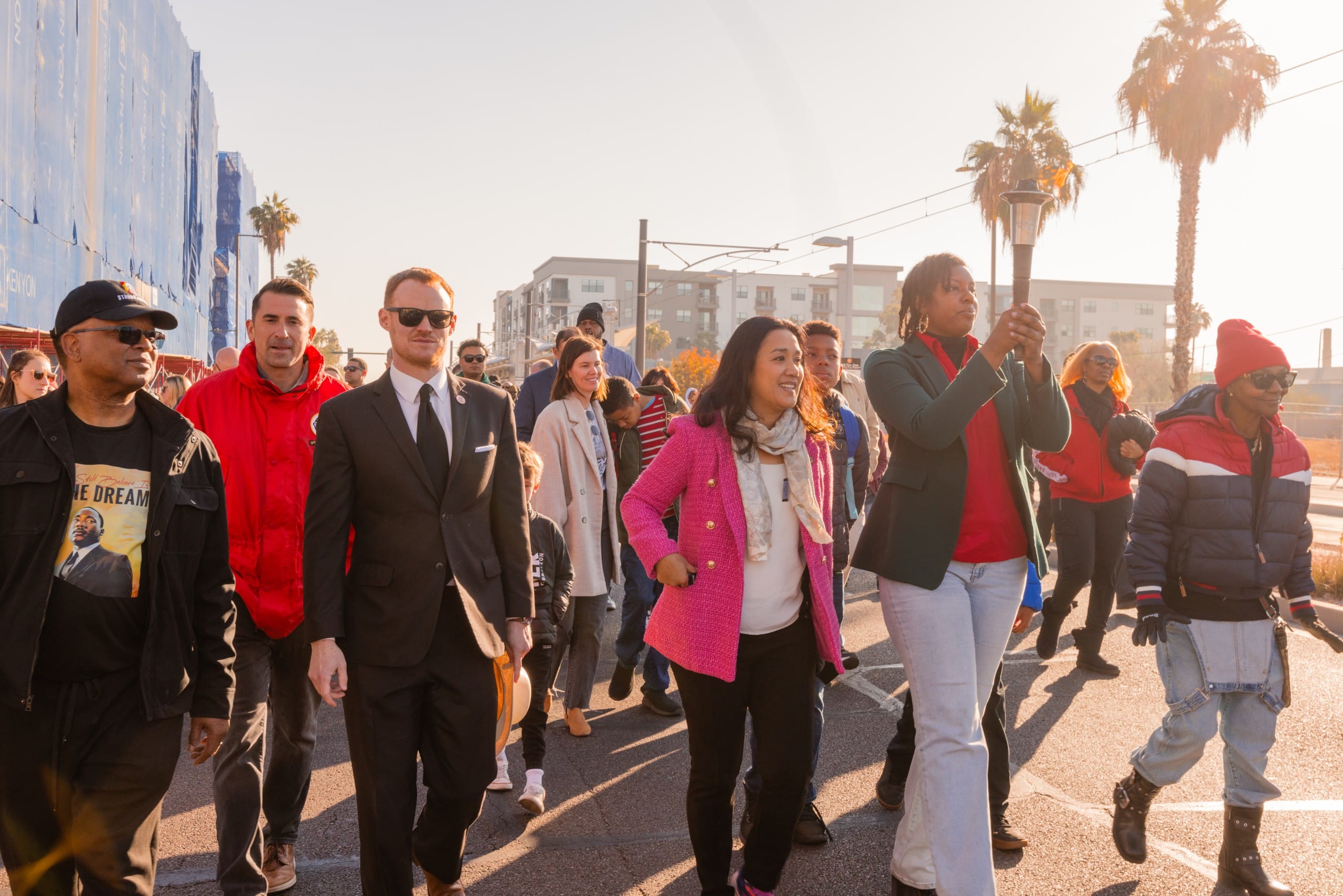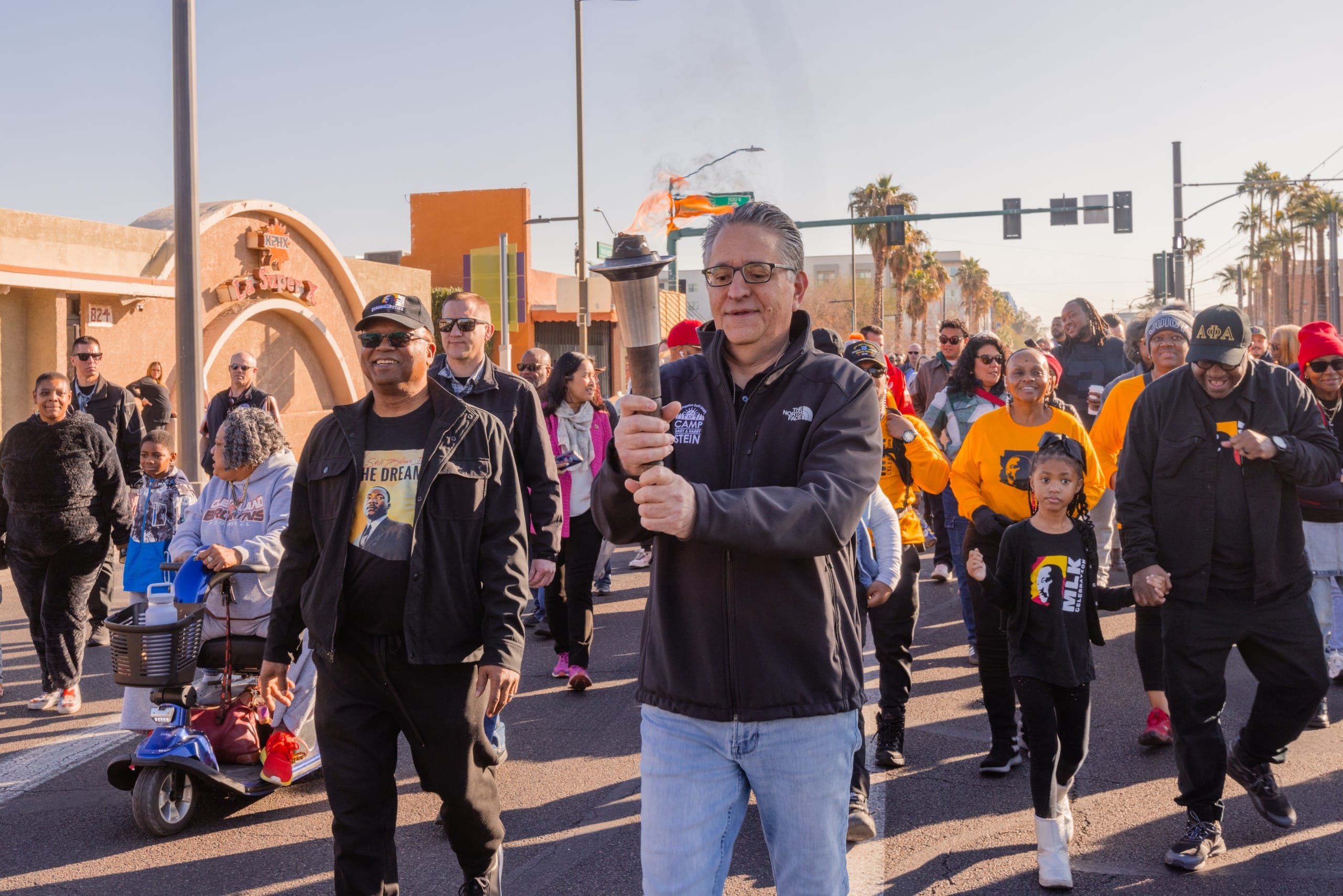 En un acto de homenaje pacífico, funcionarios públicos y representantes locales cargan la antorcha que representa la paz y la lucha durante dos millas, hasta llegar al parte Margaret T. Hance, en donde se celebra un festival para promover la unidad incluso en tiempos en los que la causa de los derechos civiles se pone a prueba con cambios políticos.