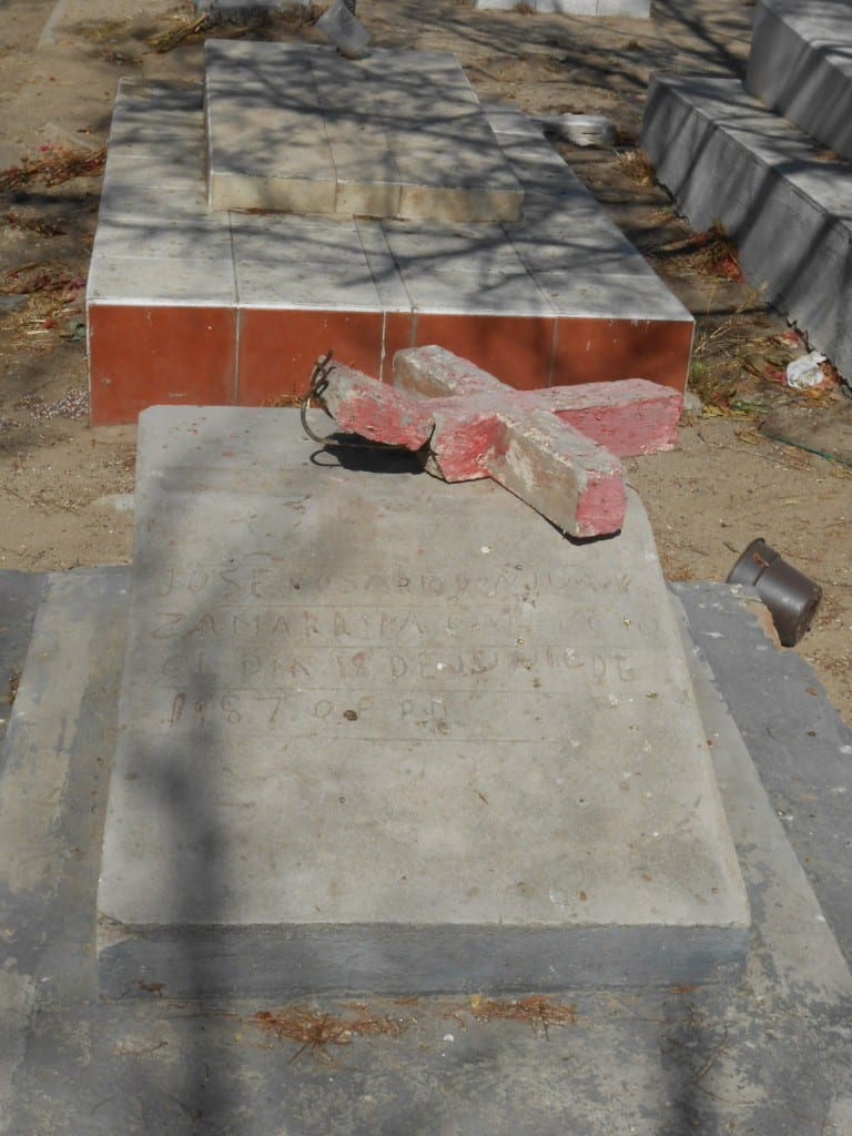 La descripción para llegar, según los trabajadores municipales que dan mantenimiento al panteón, es seguir la calle principal hasta llegar a la glorieta, rodear la misma y seguir dos calles más hacia el norte del camposanto. Ahí, hay que dar vuelta a la izquierda en una larga pero reducida, hasta topar con la barda poniente. Las dos tumbas están del lado derecho, hay que caminar unos cuantos metros para estar cerca. Están dispuestas en fila, con ‘la cabeza’ hacia el norte y los pies hacia el sur. Primero está la de Francisco Ruiz Corrales y atrás, la tumba de José Rosario Don Juan Zamarripa. Son iguales, de losetas de cemento en color gris y las cruces rojas. Así se distinguen de los demás sepulcros antiguos que hay en el también viejo panteón.