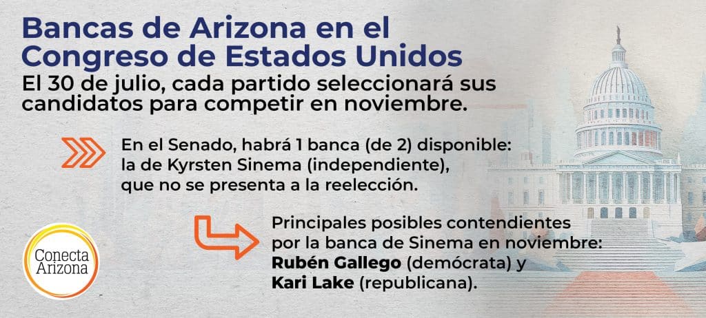 Arizona definirá este 30 de julio en elecciones primarias las candidaturas para disputar, en la elección presidencial del 5 de noviembre, un total de 10 bancas en el Congreso estadounidense: 1 en el Senado para reemplazar a la independiente Kyrsten Sinema y las 9 de la Cámara de Representantes, donde los republicanos tienen 6 de esos asientos. Se trata de las representaciones federales del estado que se pondrán en juego en noviembre y son contiendas clave para Arizona porque el Congreso es el ámbito de debate de un tema prioritario en la agenda arizonense: la política sobre inmigración y la frontera con México.
