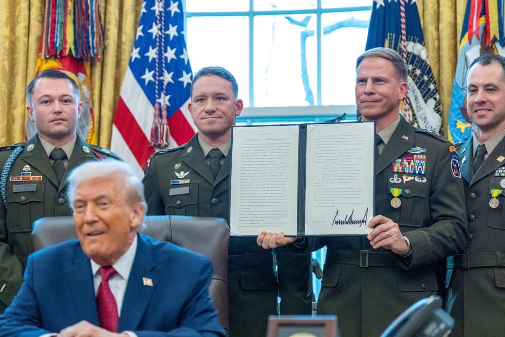 Los soldados sostienen una orden ejecutiva sobre el fentanilo firmada por el presidente Donald Trump durante una presentación de la Medalla de Defensa de la Frontera Mexicana en la Oficina Oval de la Casa Blanca, el lunes 15 de diciembre de 2025, en Washington DC. (Foto AP/Alex Brandon).
