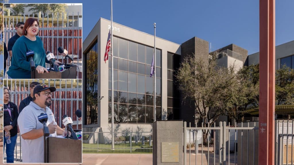 El representante estatal César Aguilar se sumó a la protesta realizada frente a ICE en Phoenix, respaldando el llamado para detener la deportación del sargento José Barco y exigir justicia para veteranos migrantes.