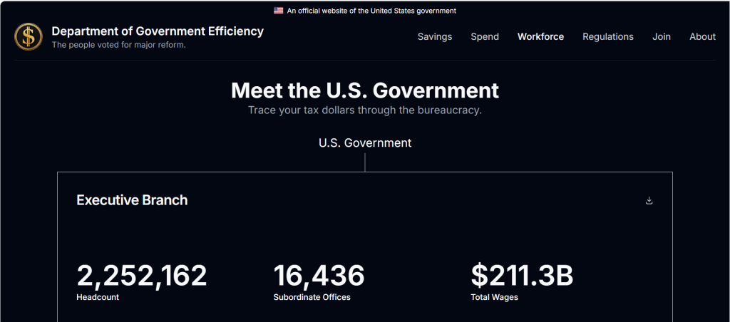 En el apartado Fuerza laboral, DOGE propone “rastrear el dinero de sus impuestos a través de la burocracia” y despliega una radiografía de los empleados del gobierno de Estados Unidos: hay 2,252,162 empleados de plantilla y 16,436 en “oficinas subordinadas”, el total de salarios alcanza los 211.3 billones, el promedio de antigüedad laboral es de 10 años de trabajo (se puede consultar según franjas de edades), el promedio salarial es de 93,828 dólares anuales (se puede consultar el número de empleados según salarios) y la edad promedio es de 47 años (también figura el detalle de cantidad de empleados por franjas de edad). El mismo detalle estadístico se aplica a 34 agencias a nivel de gabinete y a 225 agencias independientes diferenciadas según grandes, medianas y pequeñas.