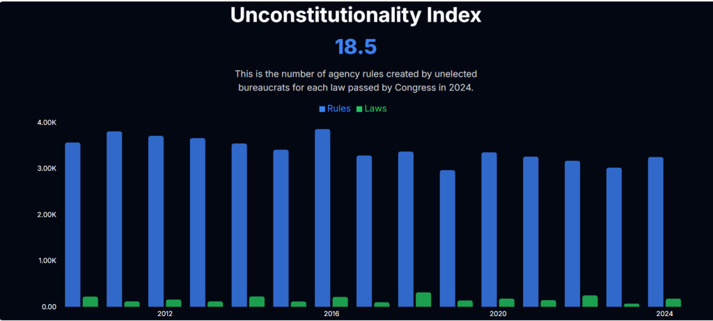 Finalmente, en el ítem Regulaciones DOGE compara desde 2010 hasta 2024 el número de regulaciones dictadas por “burócratas no electos” (así los define) y de leyes aprobadas por el Congreso, con una amplia diferencia a favor de las primeras: en 2024 hubo 3,250 regulaciones y solo 176 leyes. Este contraste es señalado bajo el título “índice de inconstitucionalidad”. Además, DOGE detalla las regulaciones federales en cada agencia gubernamental.