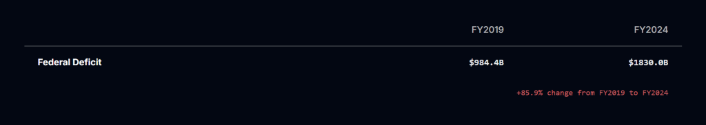 En el ítem Gastos, DOGE compara los gastos en dólares de los años fiscales 2019 y 2024, en todos los Departamentos, agencias y áreas del gobierno federal, además del Poder Legislativo y el Poder Judicial, y concluye que el déficit federal fue de 1,830 billones de dólares en 2024, un 85.9% más que en 2019 (984 billones de dólares). Este déficit es el resultado de que, entre 2019 y 2024, los ingresos aumentaron el 42%, pero los gastos se incrementaron casi un 52% (pasaron de 4,446 billones de dólares a 6,746 billones de dólares). DOGE también compara -entre ambos años- todas las fuentes de ingreso del estado, con detalles de los impuestos individuales y de las empresas, del seguro social, impuestos especiales, impuestos sobre bienes y donaciones, derechos arancelarios y otros ingresos: la conclusión es que -en 2019- los ingresos fueron 3,463 billones de dólares y -en 2024- se recaudó un total de 4,918 billones (42% más).