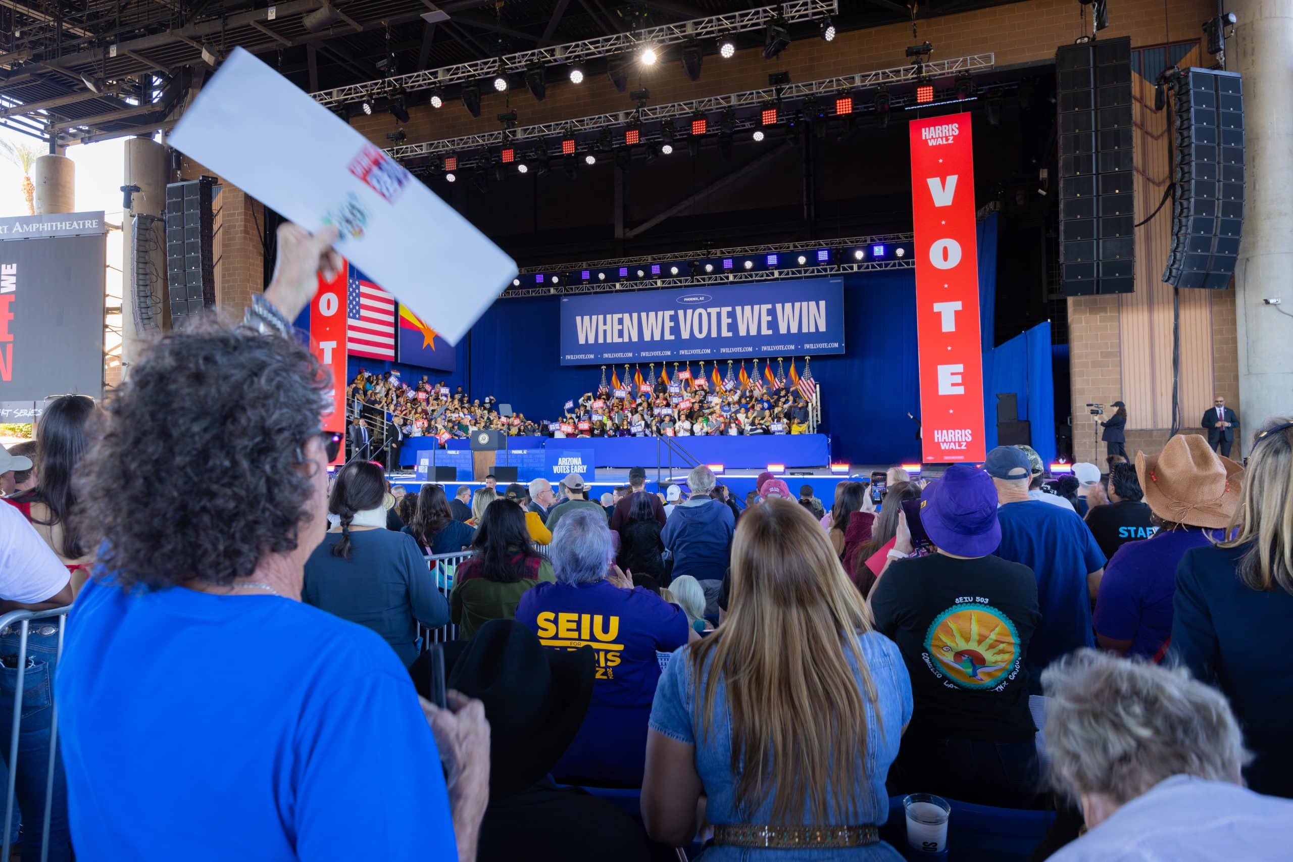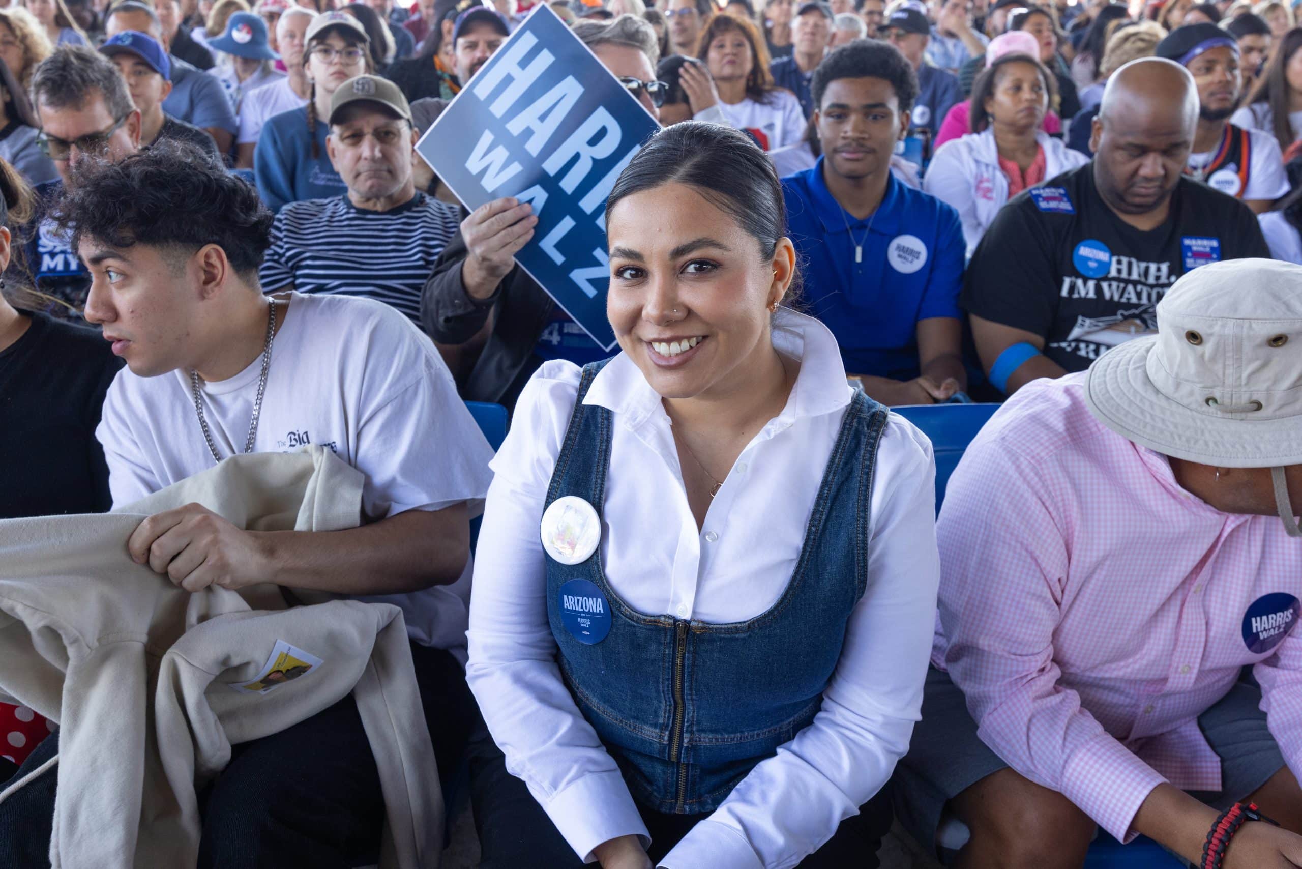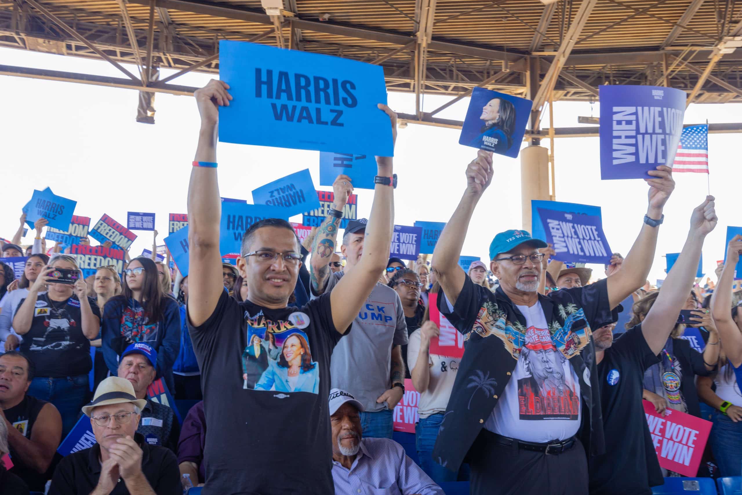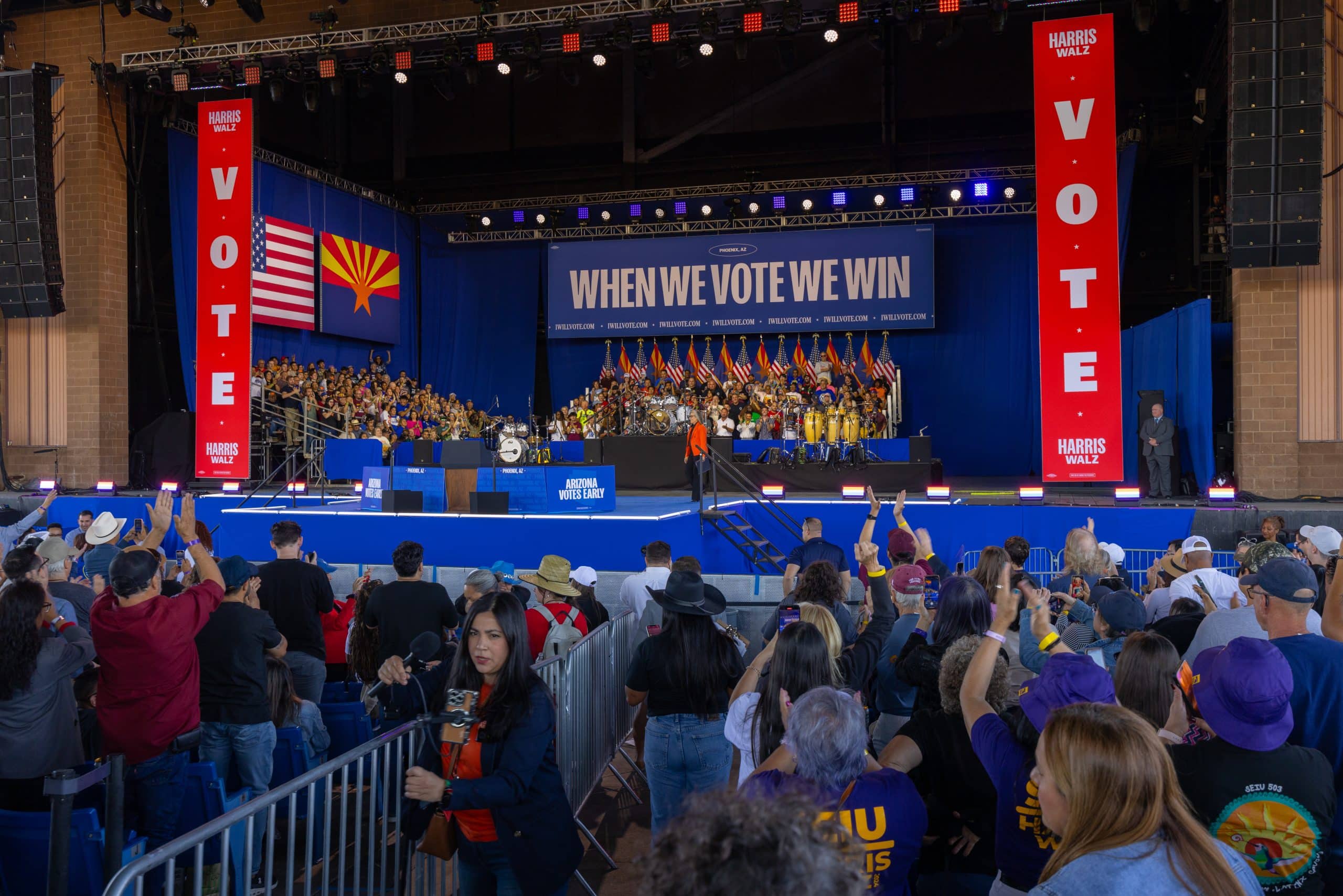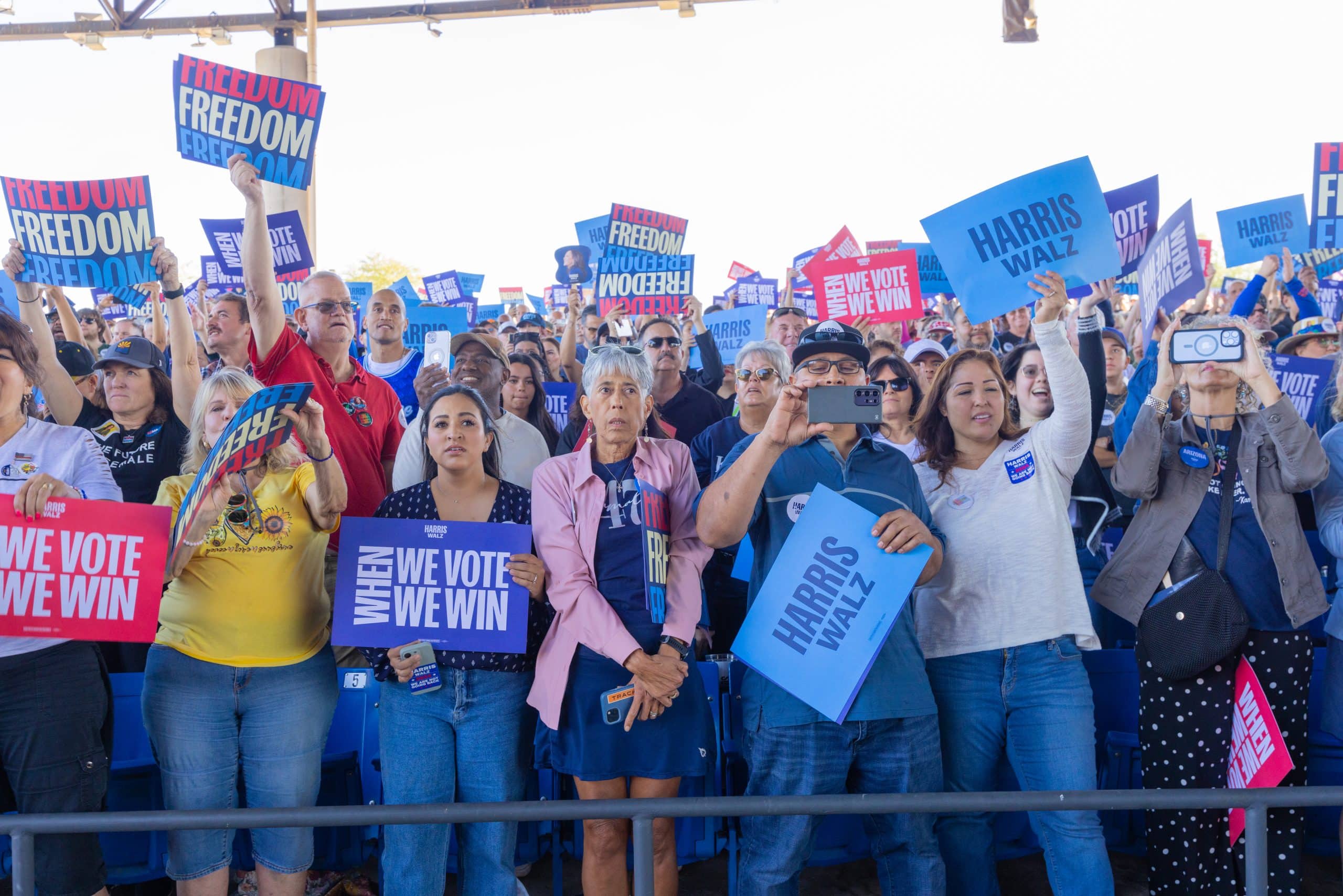 Las puertas del Anfiteatro Talking Stick Resort, en el oeste de Phoenix, abrieron alrededor de las 10:00 de la mañana del jueves 31 de octubre. Cientos de asistentes, en su mayoría demócratas, llegaron para ratificar su apoyo a la fórmula de Harris y Walz. Hacían olas, bailaban y celebraban por adelantado los resultados electorales del 5 de noviembre.