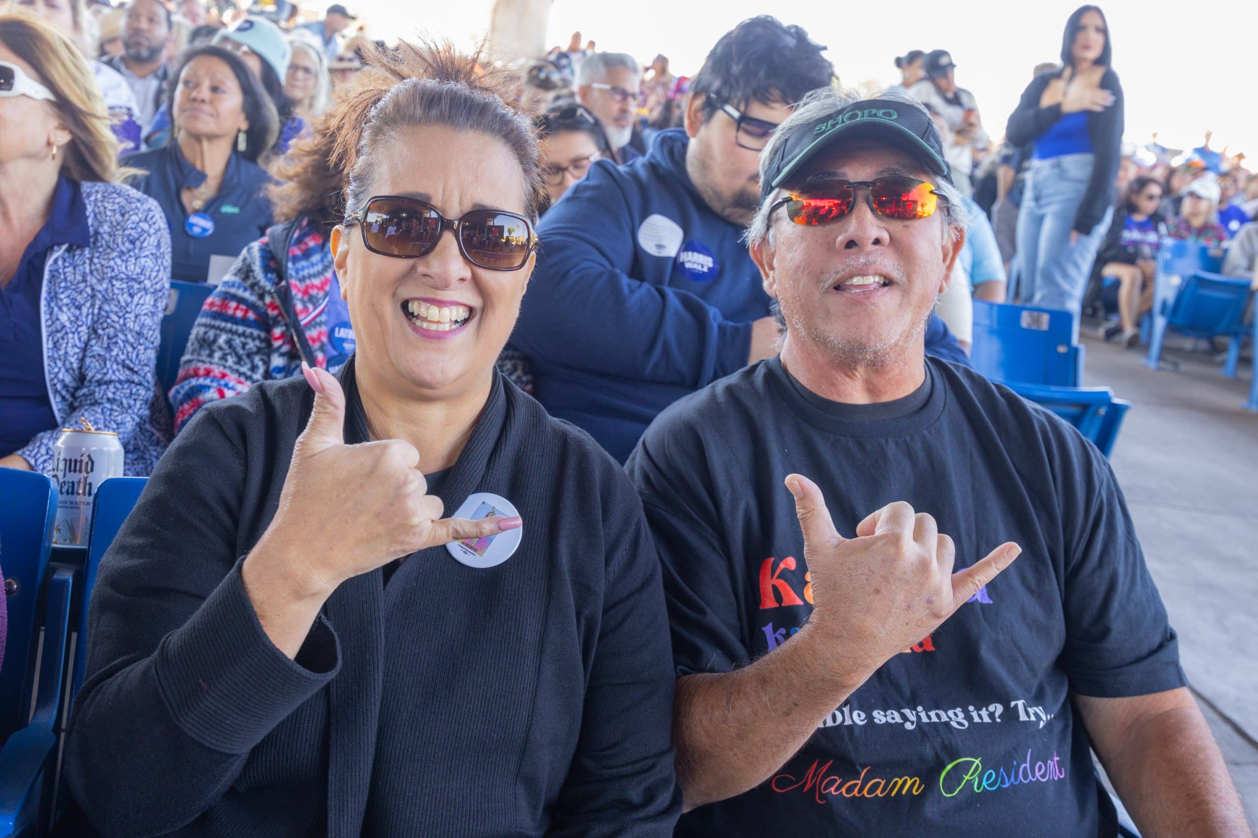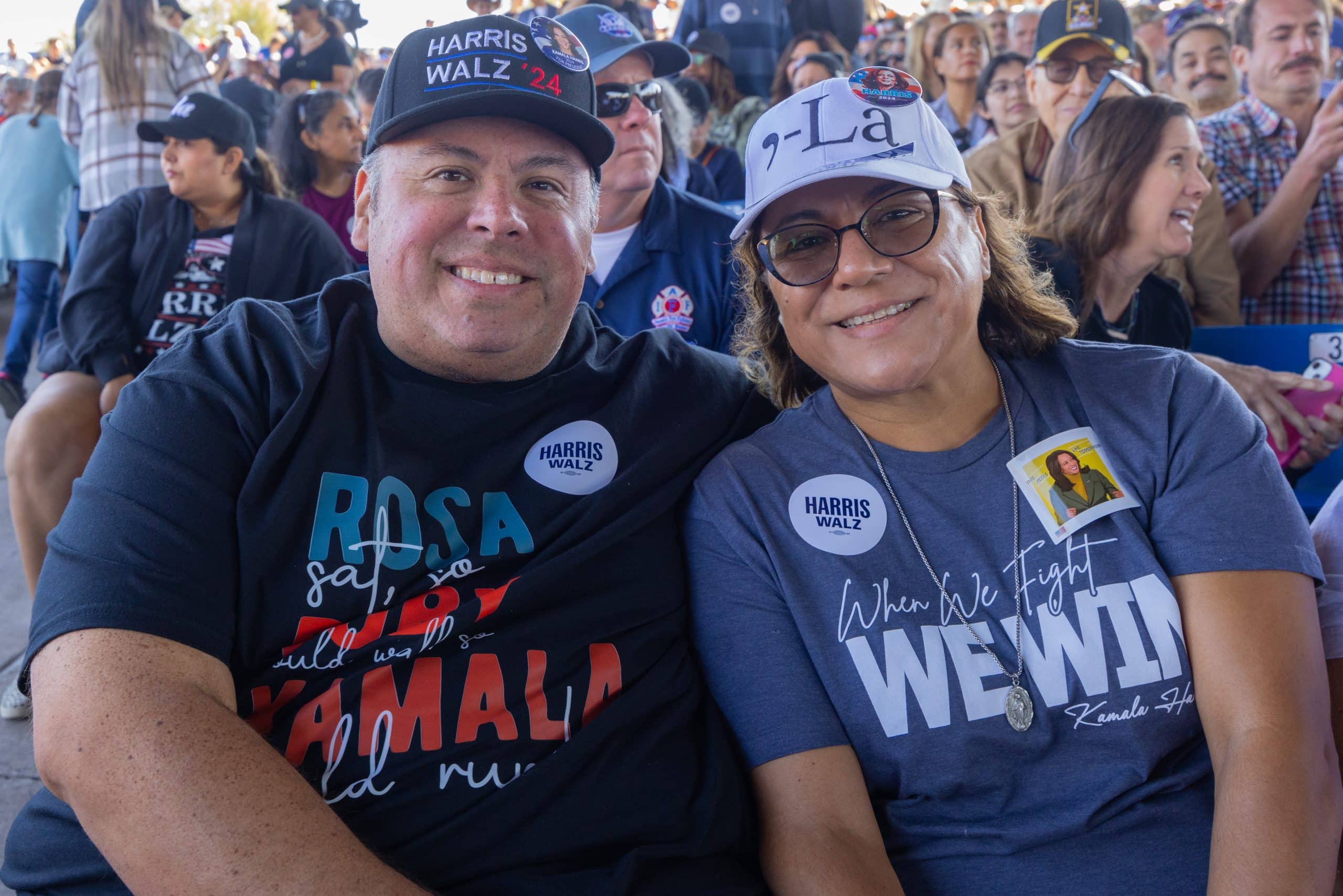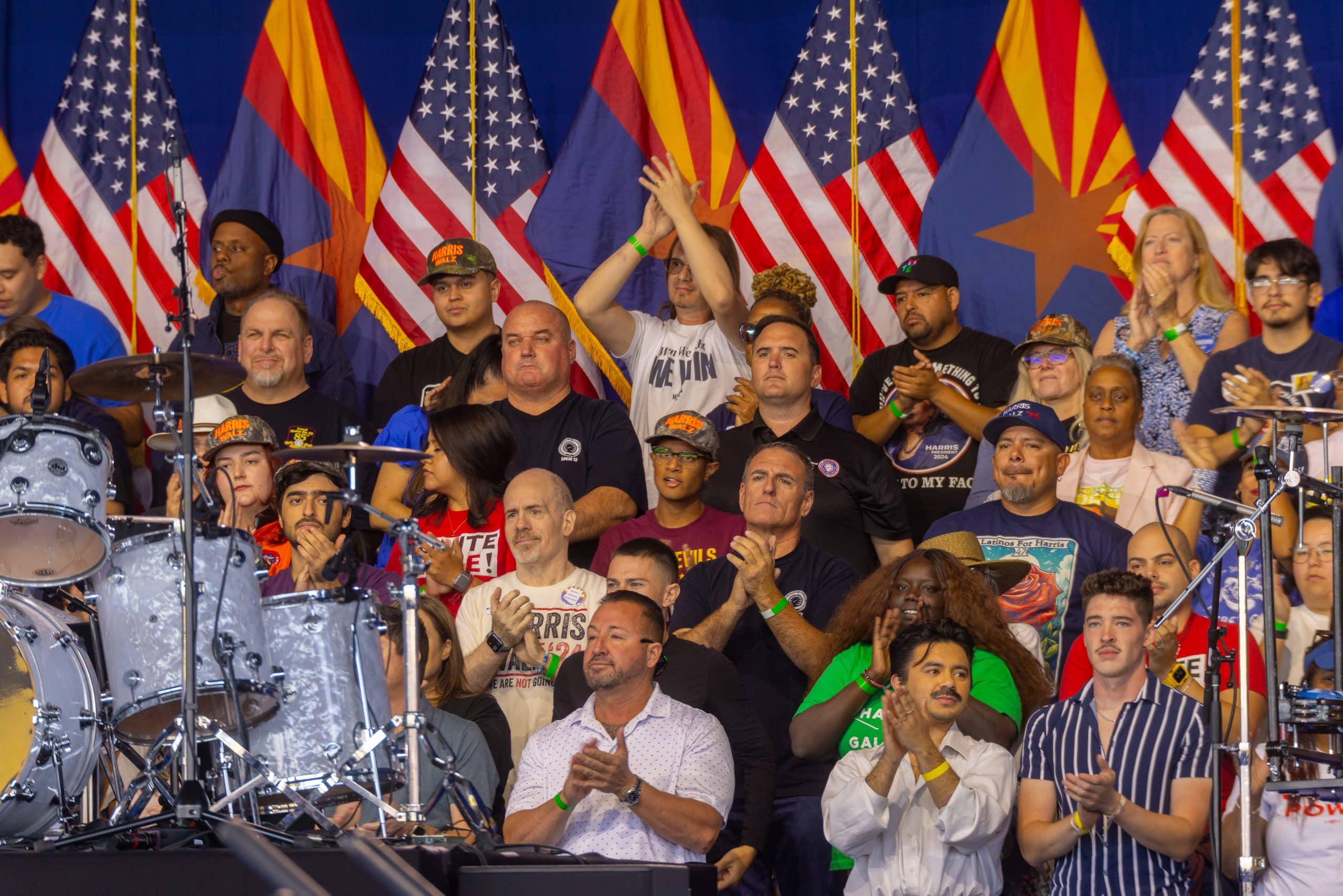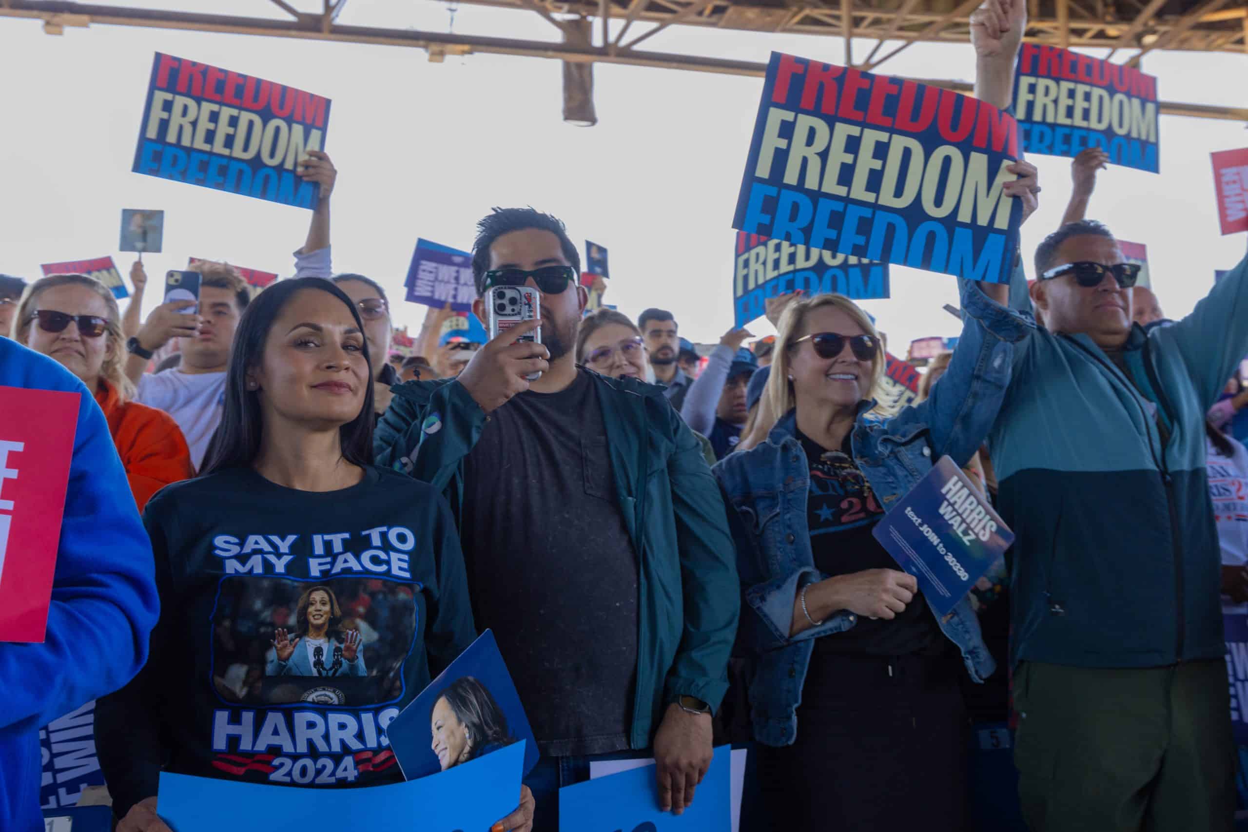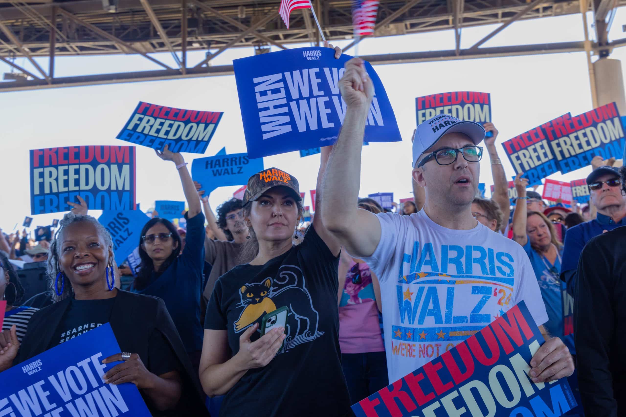 Las puertas del Anfiteatro Talking Stick Resort, en el oeste de Phoenix, abrieron alrededor de las 10:00 de la mañana del jueves 31 de octubre. Cientos de asistentes, en su mayoría demócratas, llegaron para ratificar su apoyo a la fórmula de Harris y Walz. Hacían olas, bailaban y celebraban por adelantado los resultados electorales del 5 de noviembre.