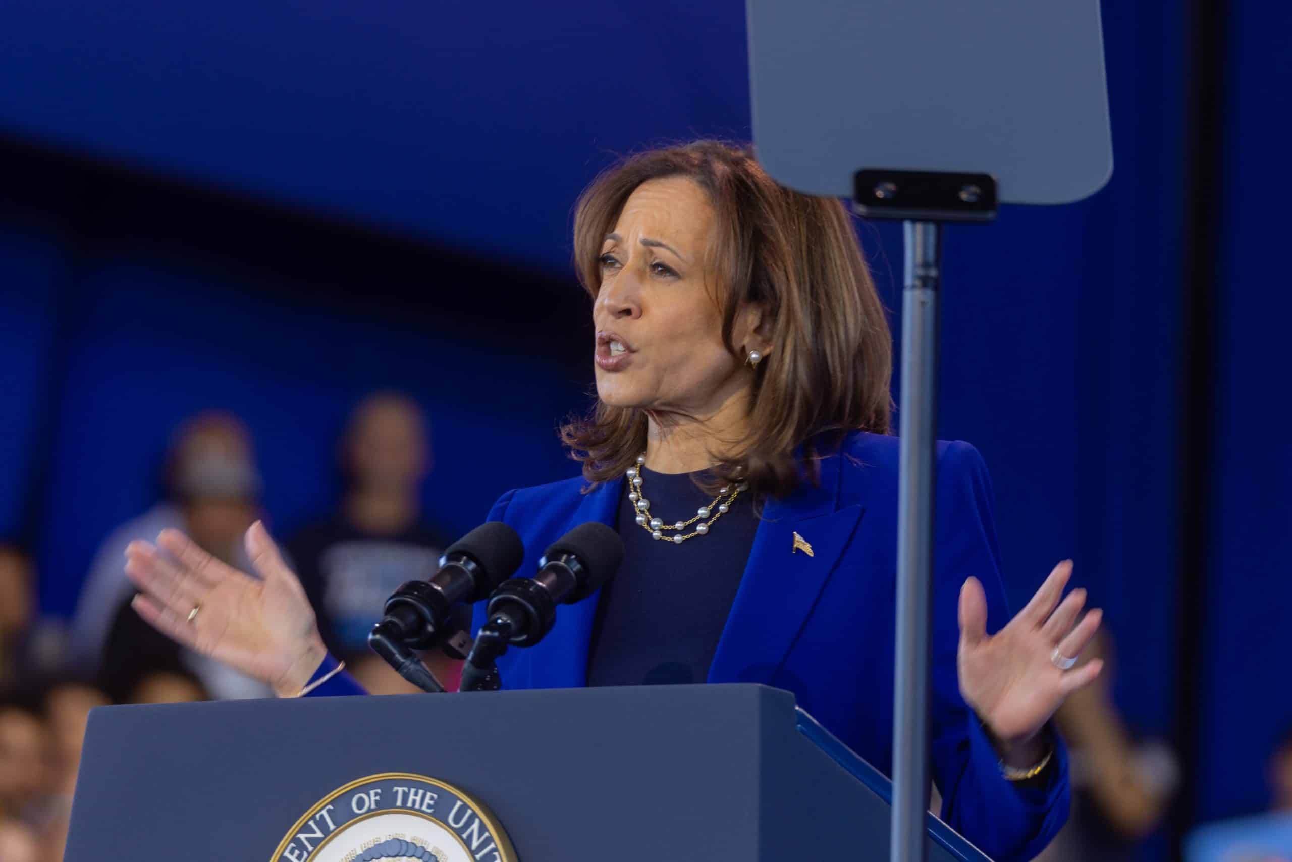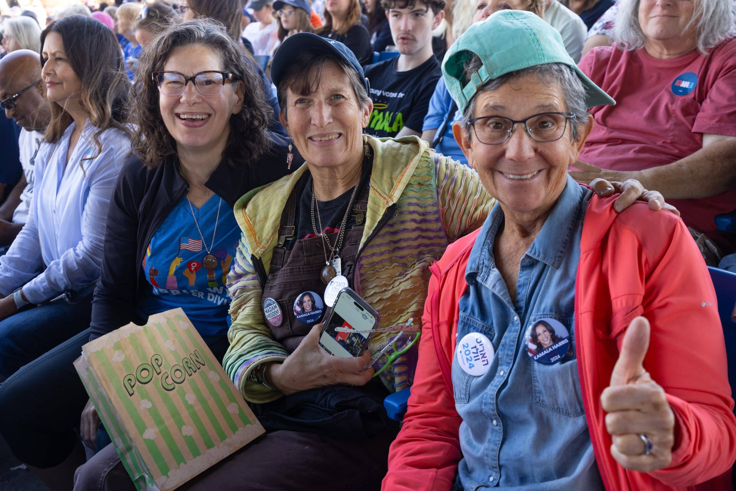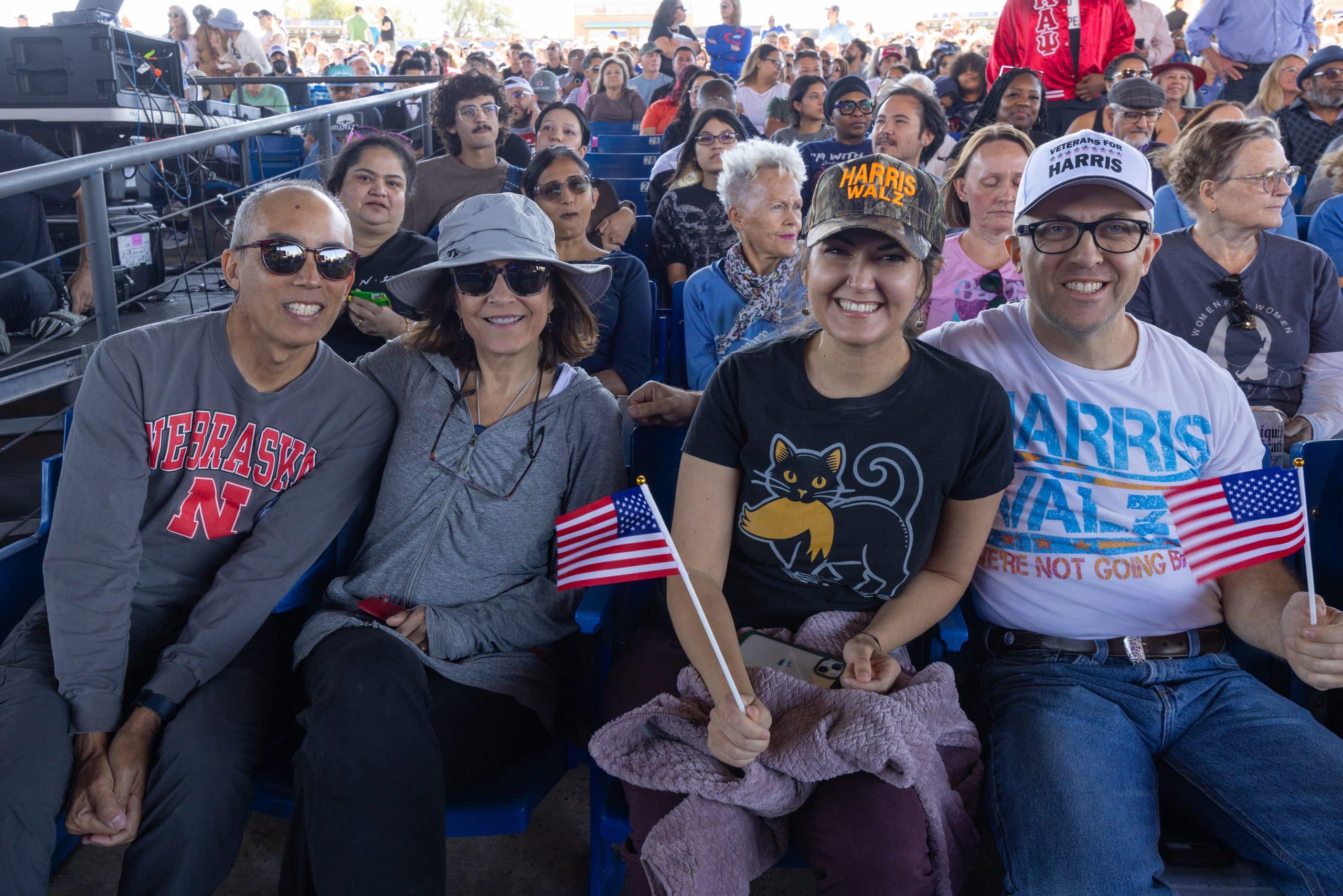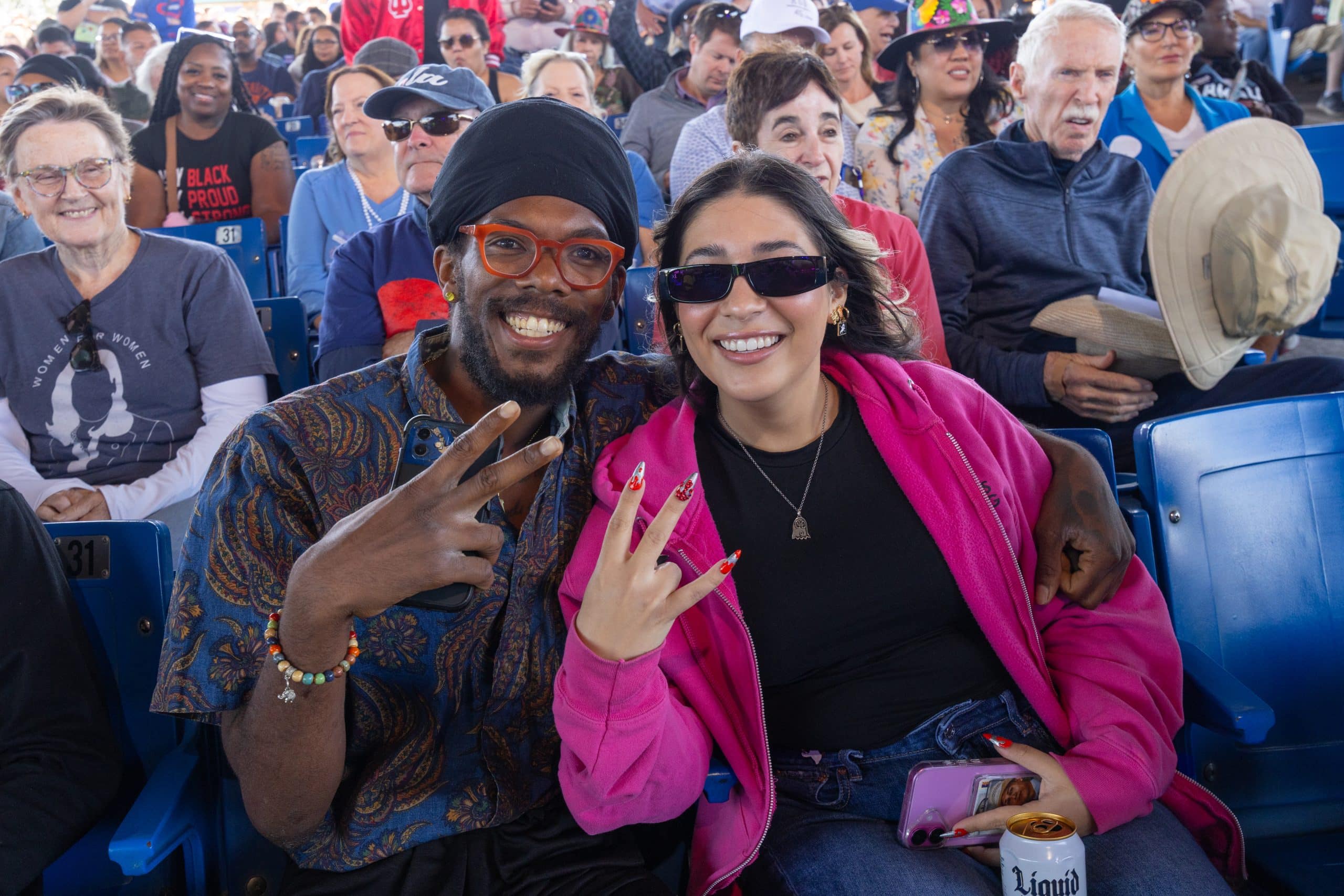 Casi a las 2:00 de la tarde, la vicepresidenta Kamala Harris subió al escenario portando un traje azul que combinaba con los colores de su partido. En el anfiteatro, en el que caben 20 mil personas, la mayoría de los asientos estaban llenos de personas con pancartas a favor de la fórmula Harris-Walz.