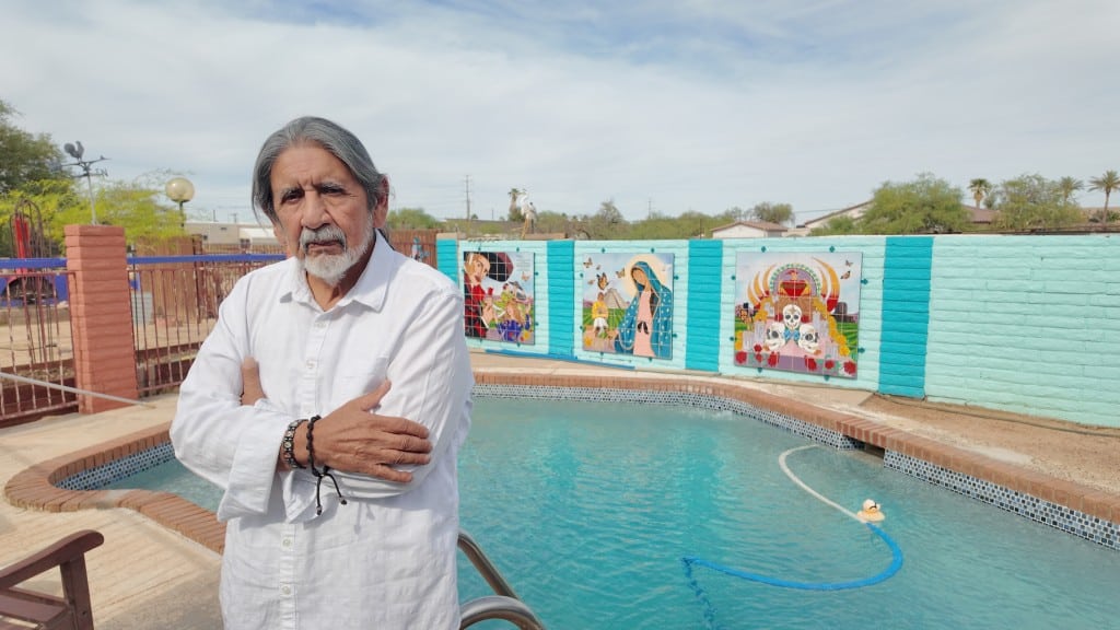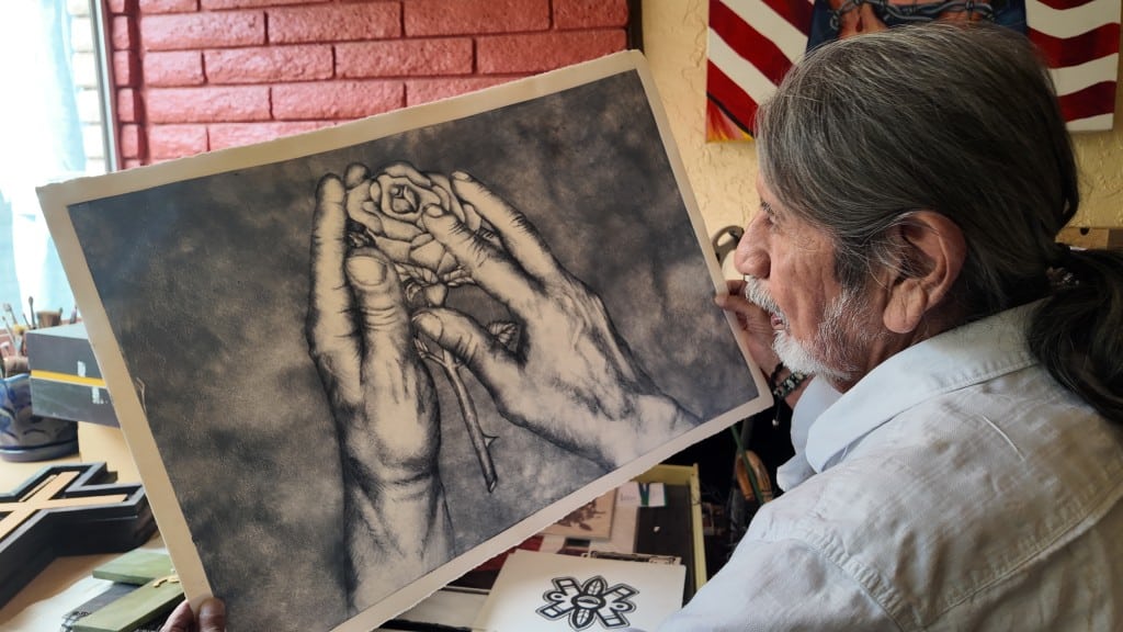 El maestro tiene cinco hijos y varios nietos, algunos de ellos artistas como él. “Tengo dos que siguen en el arte y tengo dos nietas que también están siguiendo una carrera en el arte, una está en película y la otra quiere ser maestra de arte. Entonces, ya hice mi trabajo. Creo que completé lo que tengo que hacer porque el movimiento sigue”. Así se refiere al legado que ha dejado dentro de su núcleo más cercano. Agrega que una de las expresiones que más disfruta y que le conecta con Arizona es el muralismo, actividad que ahora desarrolla en equipo: “Trabajo mucho con mi hijo Reggie que también es artista, y él pinta con el bote (la lata de aerosol). Es una combinación de los dos. Yo con la brocha y él con la con el bote”.