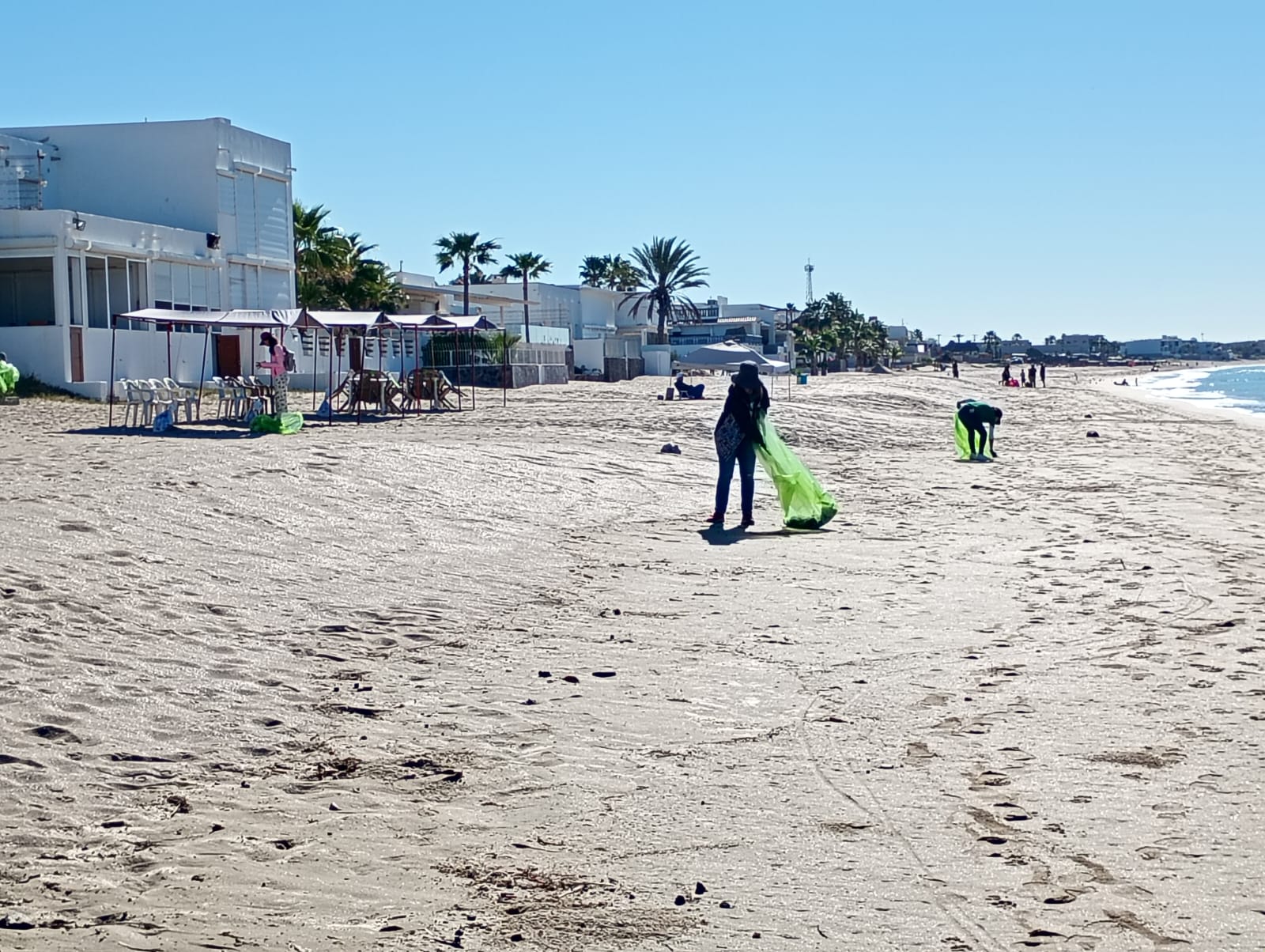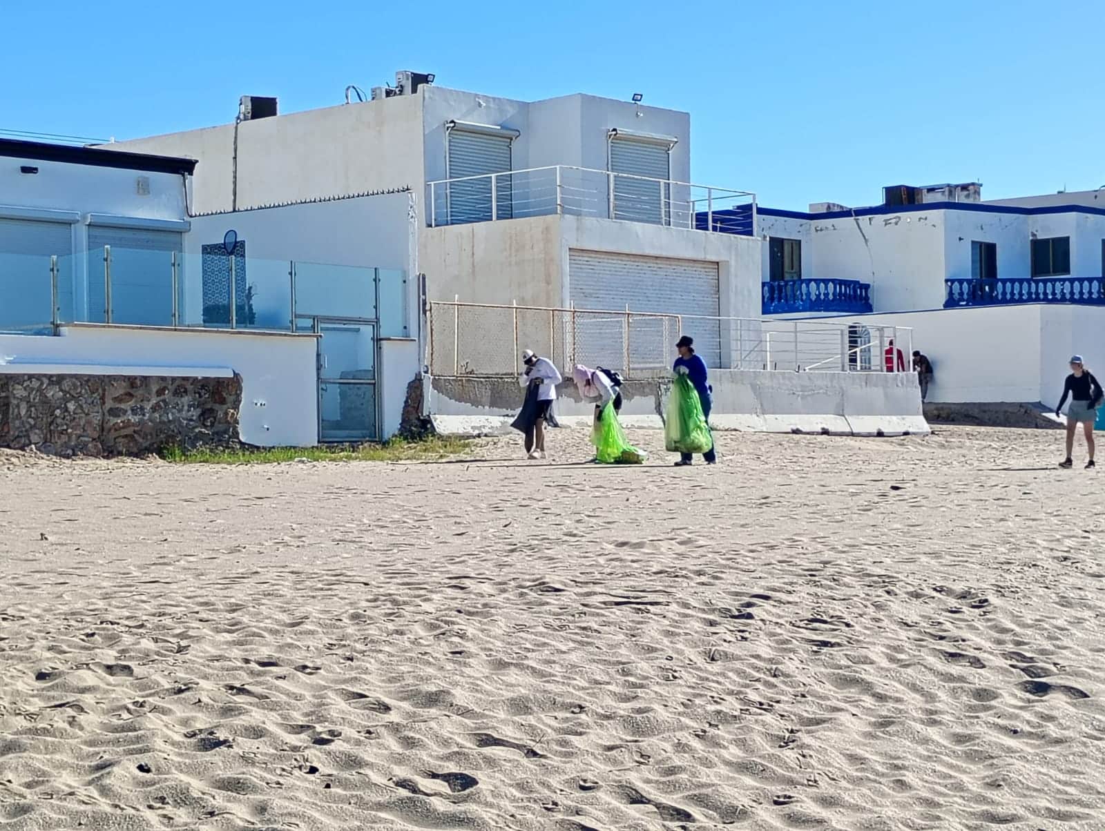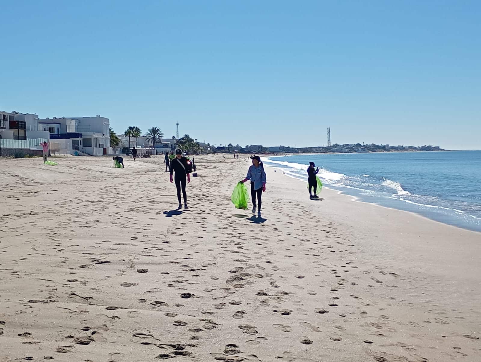 Una vez que llegaron a Bahía de Kino, comenzó la repartición de grandes bolsas y de guantes, algunos las llevaban y compartían, otros las recibían y sin mucho preámbulo comenzaban a caminar por la playa.